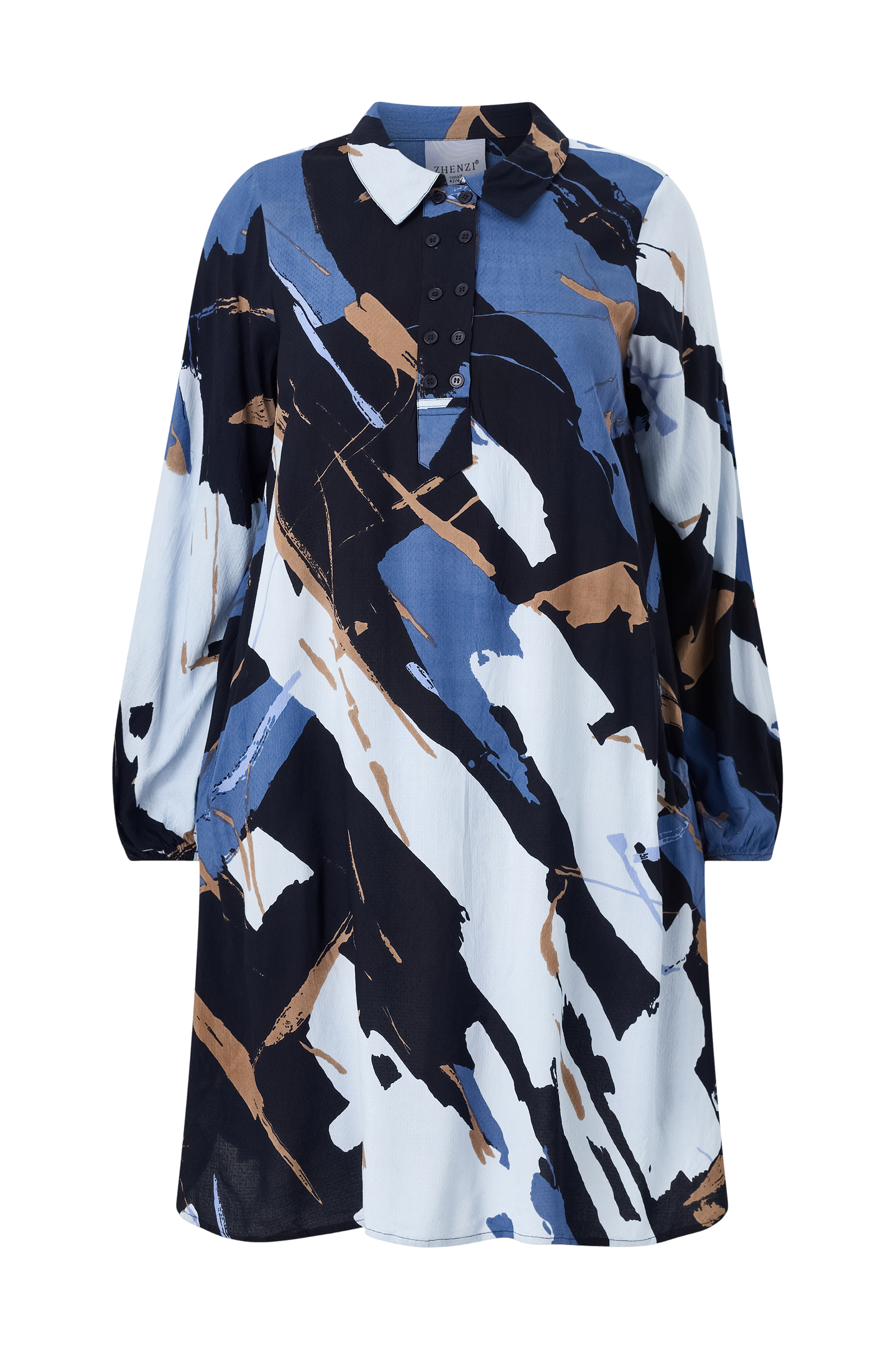 • Mønstret kjole med strukturprikker• Løs pasform• Krave med kort, dobbeltbrystet knaplukning foran• Lange ærmer med elastiske ærmeafslutninger• Afrundet søm med slidser i siderne• Plusstørrelser• Længde: 105 cm i størrelse S