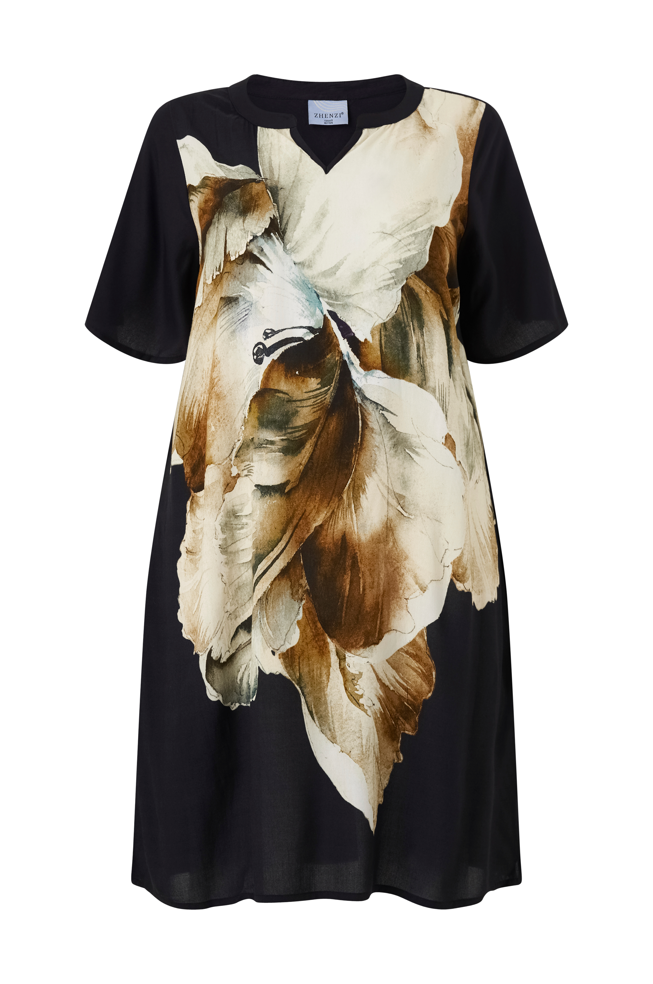 • Store størrelser• Lige, uformel model• Rund hals med lille ventilation foran• Kort, bredt ærme• Sidelommer• Slids nede i siderne• Længde: 105 cm i størrelse 42/44