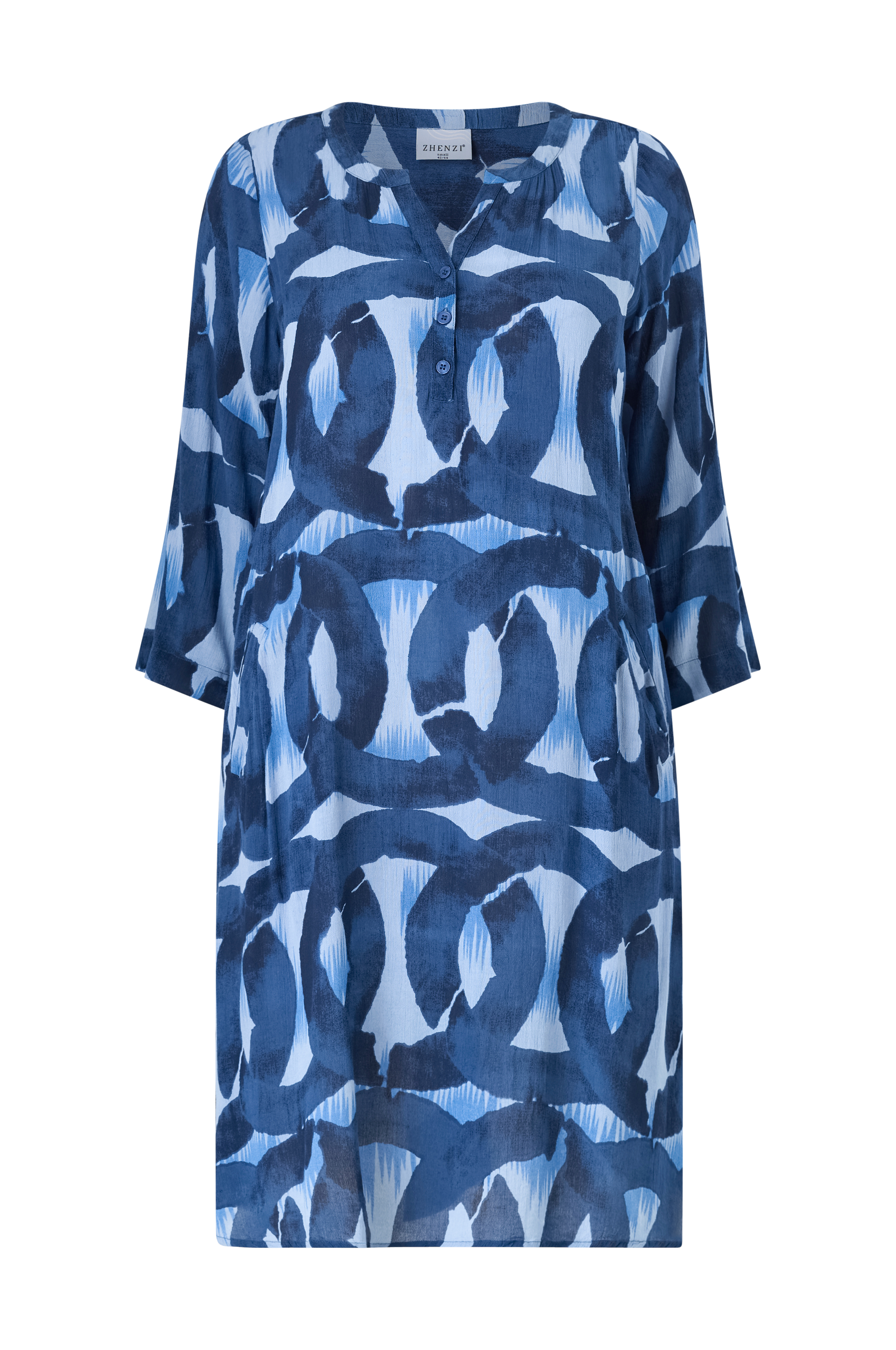 • Mønstret, semitransparent kjole i tynd viskose• V-formet halsudskæring med kort knaplukning foran• Lange, brede ærmer• Sidelommer• Slids i siderne• Afslappet pasform• Længde: 104 cm i størrelse S• Plusstørrelser