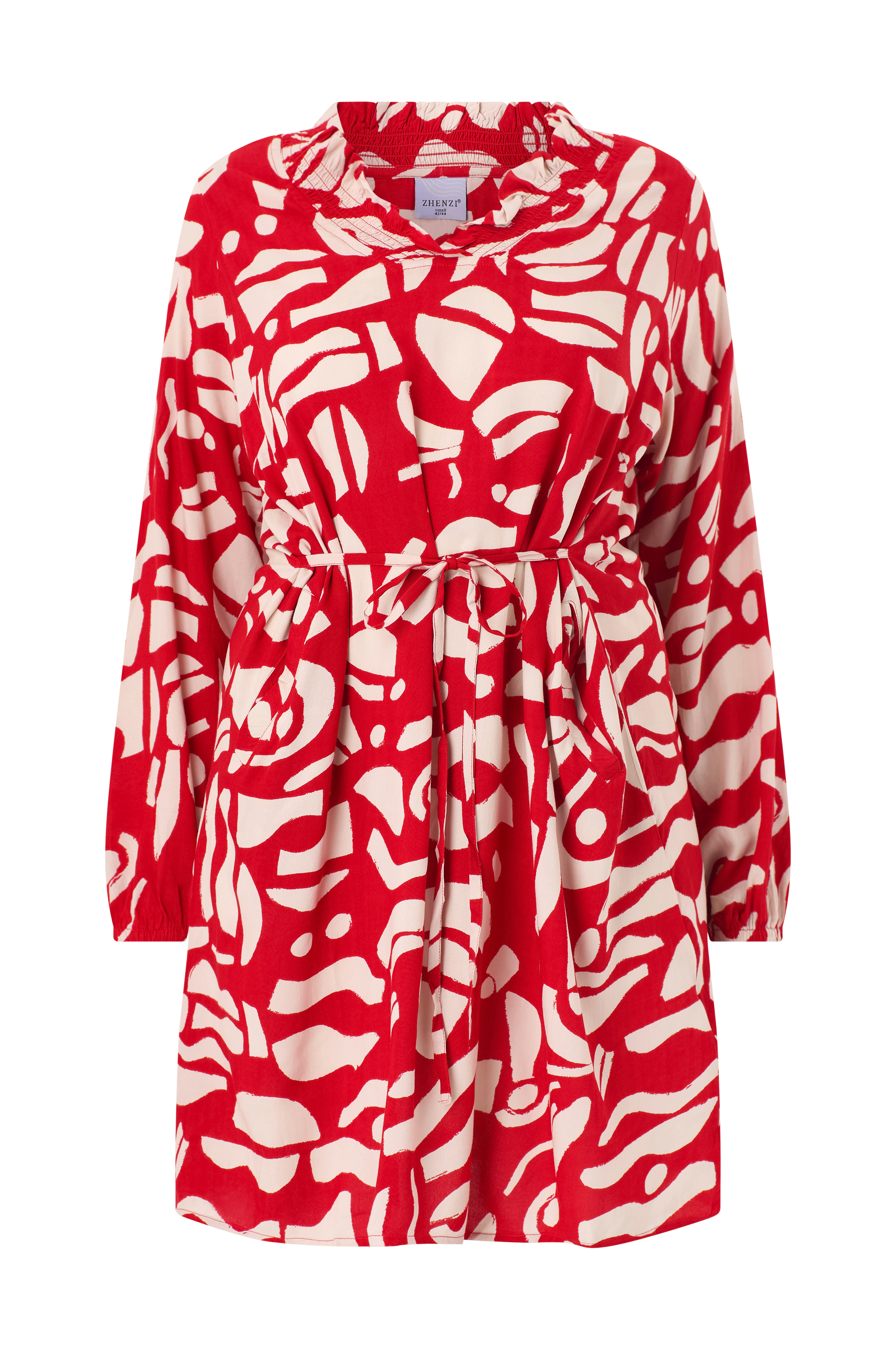 • Mønstret kjole i viskose• V-udskæring med flæsekant og smockdetalje hele vejen rundt• Lange ærmer• Elastik ved manchetterne• Bindebånd i siderne• Sidelommer• Plusstørrelser• Længde: 106 cm i størrelse S