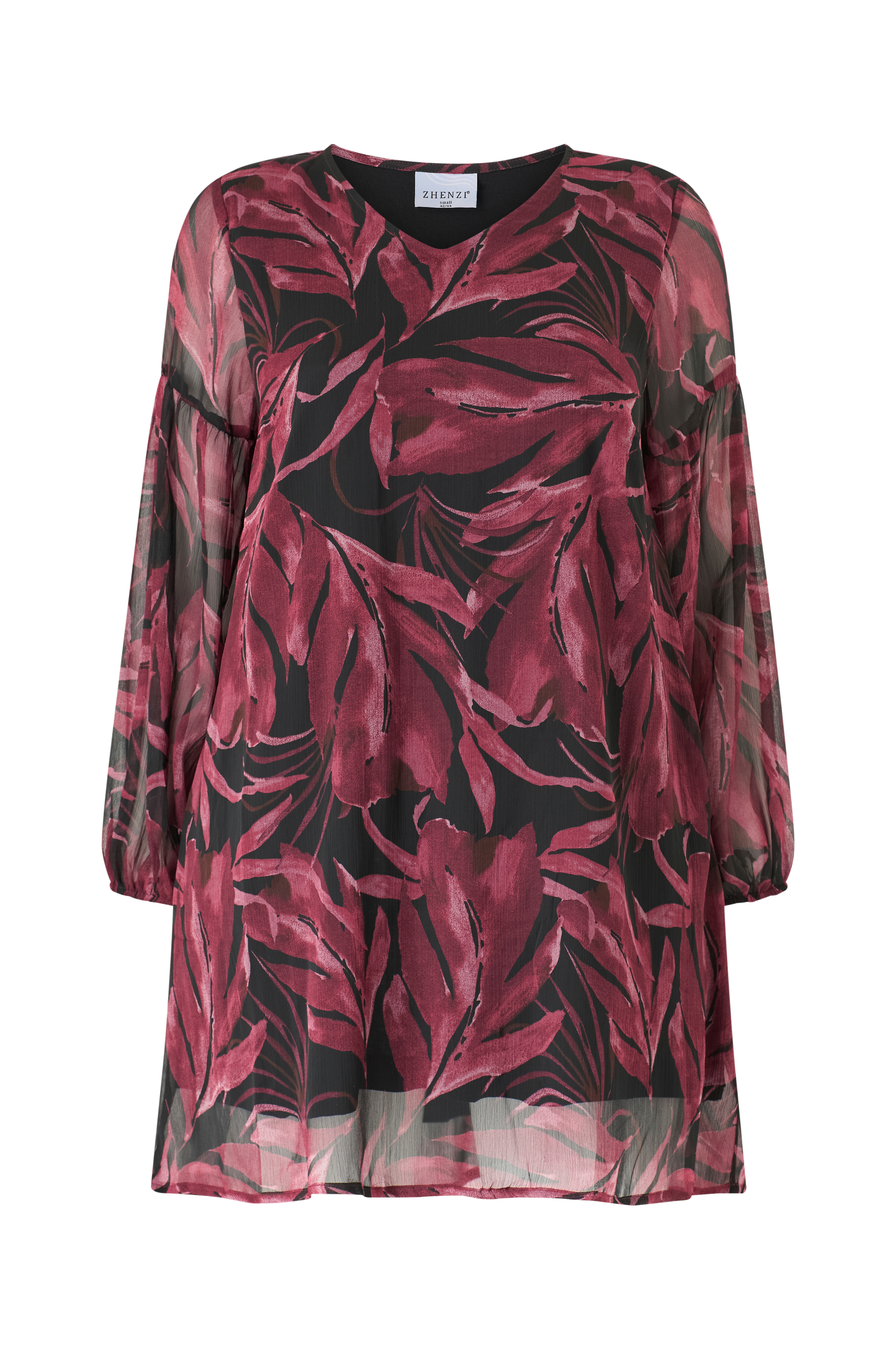 • Mønstret kjole i chiffon• V-udskæring• Lange ballonærmer• Tekstilforing• Plusstørrelser• Længde: 97 cm i størrelse S