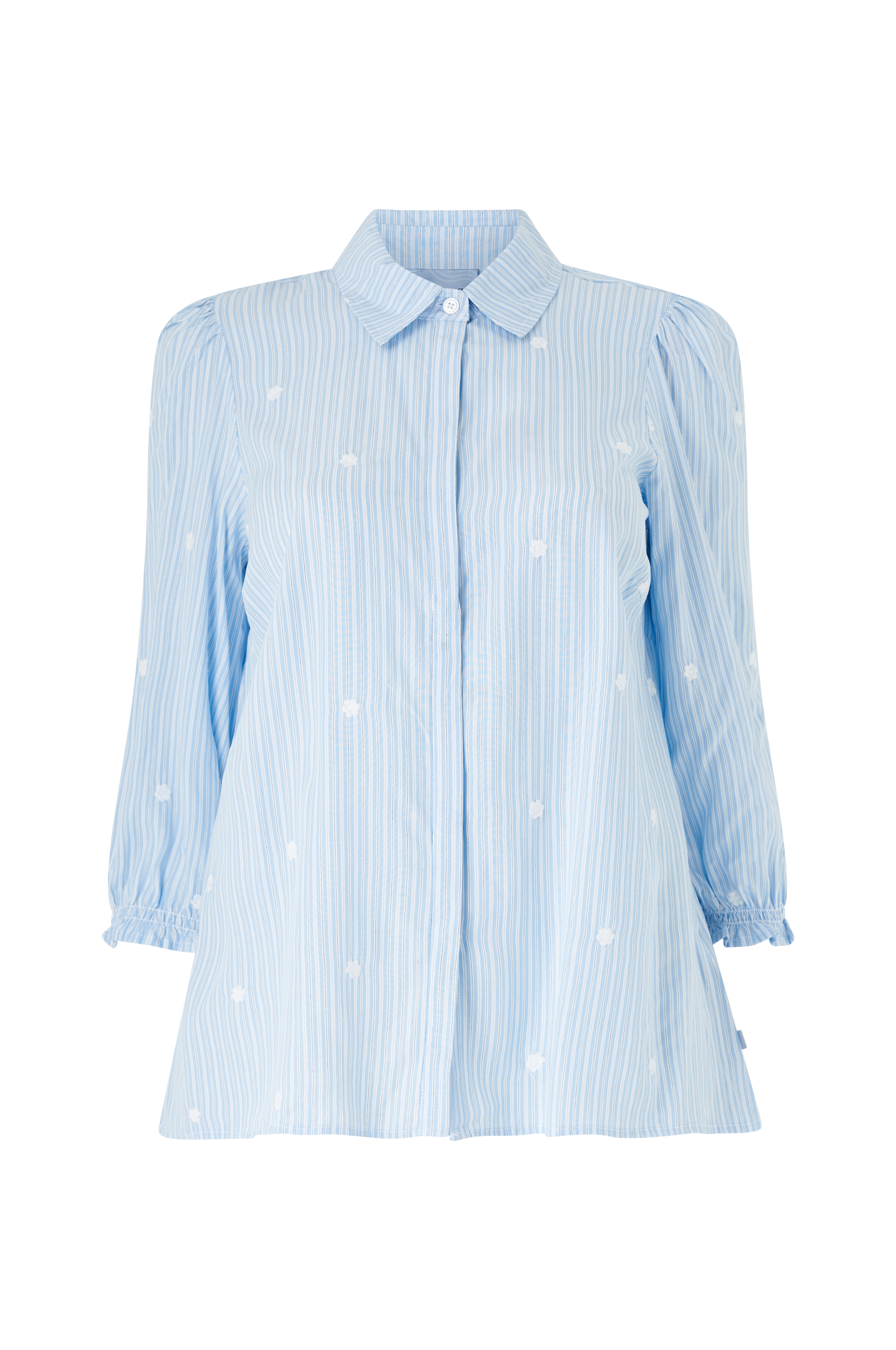 • Stribet skjorte i viskose med broderede blomster hele vejen rundt• 3/4 lange ærmer med elastik ved manchetterne• Skjulte knapper• Store størrelser
