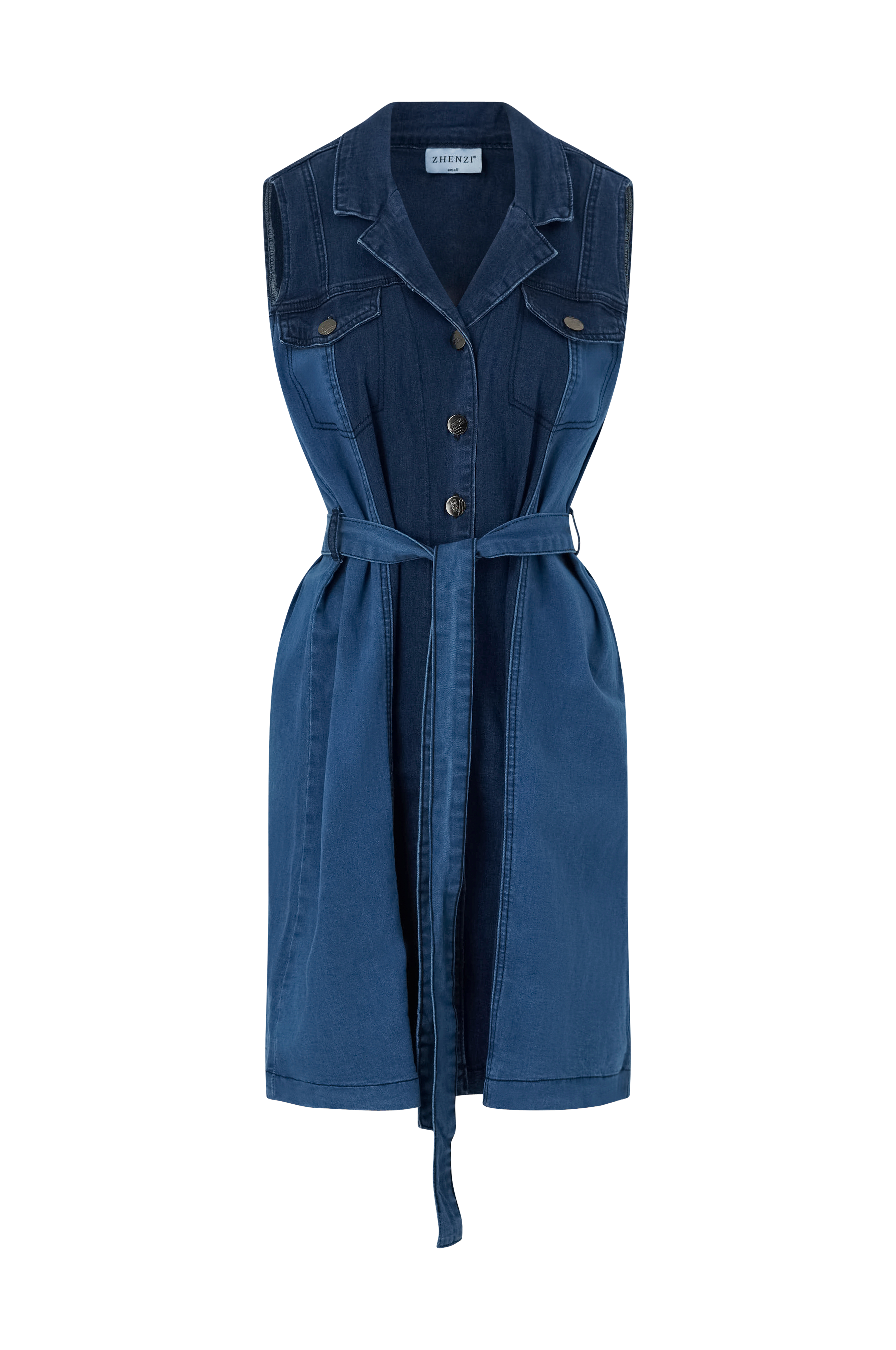 • Ærmeløs model i denim• Krave med revers• Metalknapper foran• Snydelommer på brystet• Stropper med bindebælte• Vertikale sømme• Længde: 95 cm i størrelse S