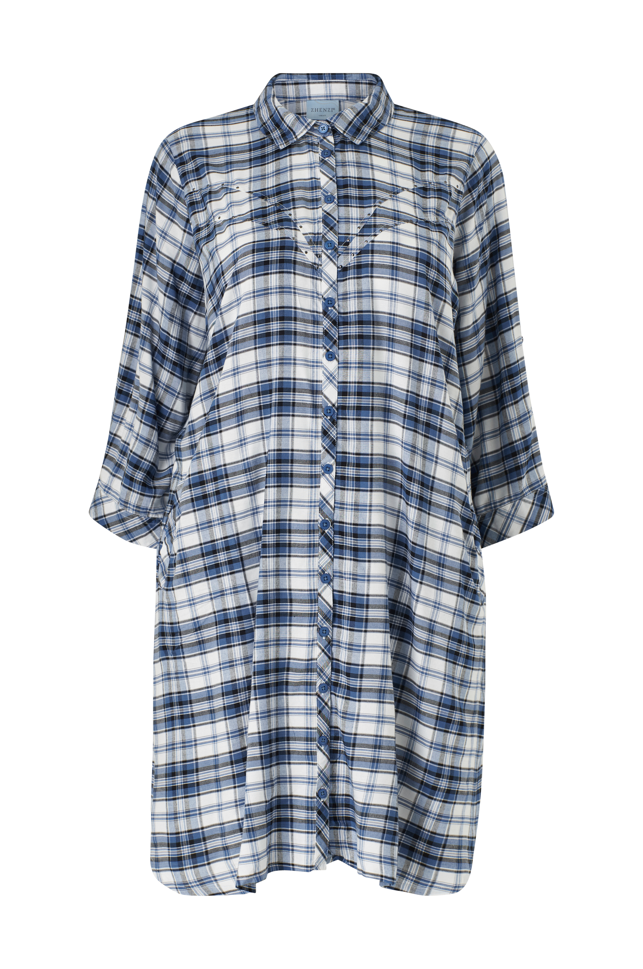 • Store størrelser• Model med svaj i cowboystil med små nitter på brystet• Lille krave• Knapper hele vejen frem• Langt, bredt ærme med manchet• Afrundede slidser nede i siderne• Længde: 105 cm i størrelse S