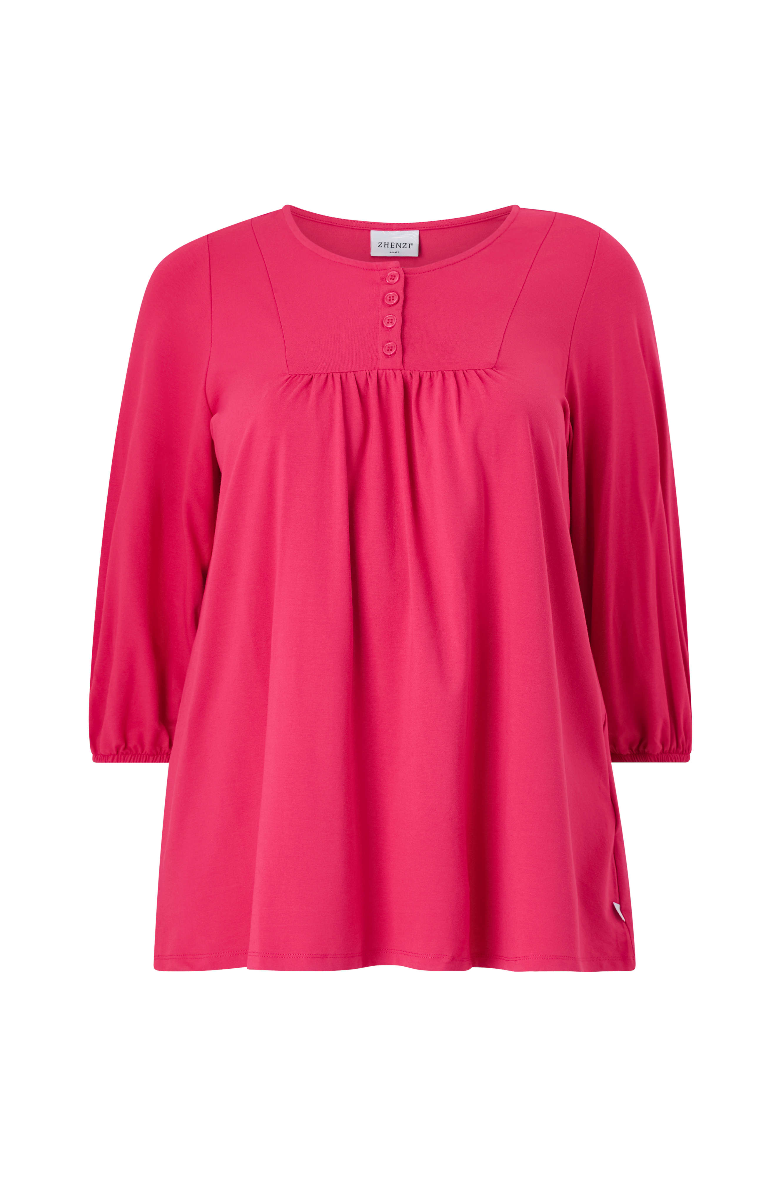 • Fremstillet af elastisk viskosejersey• Rund halsudskæring• Fire knapper foran• Rynkeeffekter midt foran• 3/4 lange ærmer med elastik ved manchetterne• Store størrelser