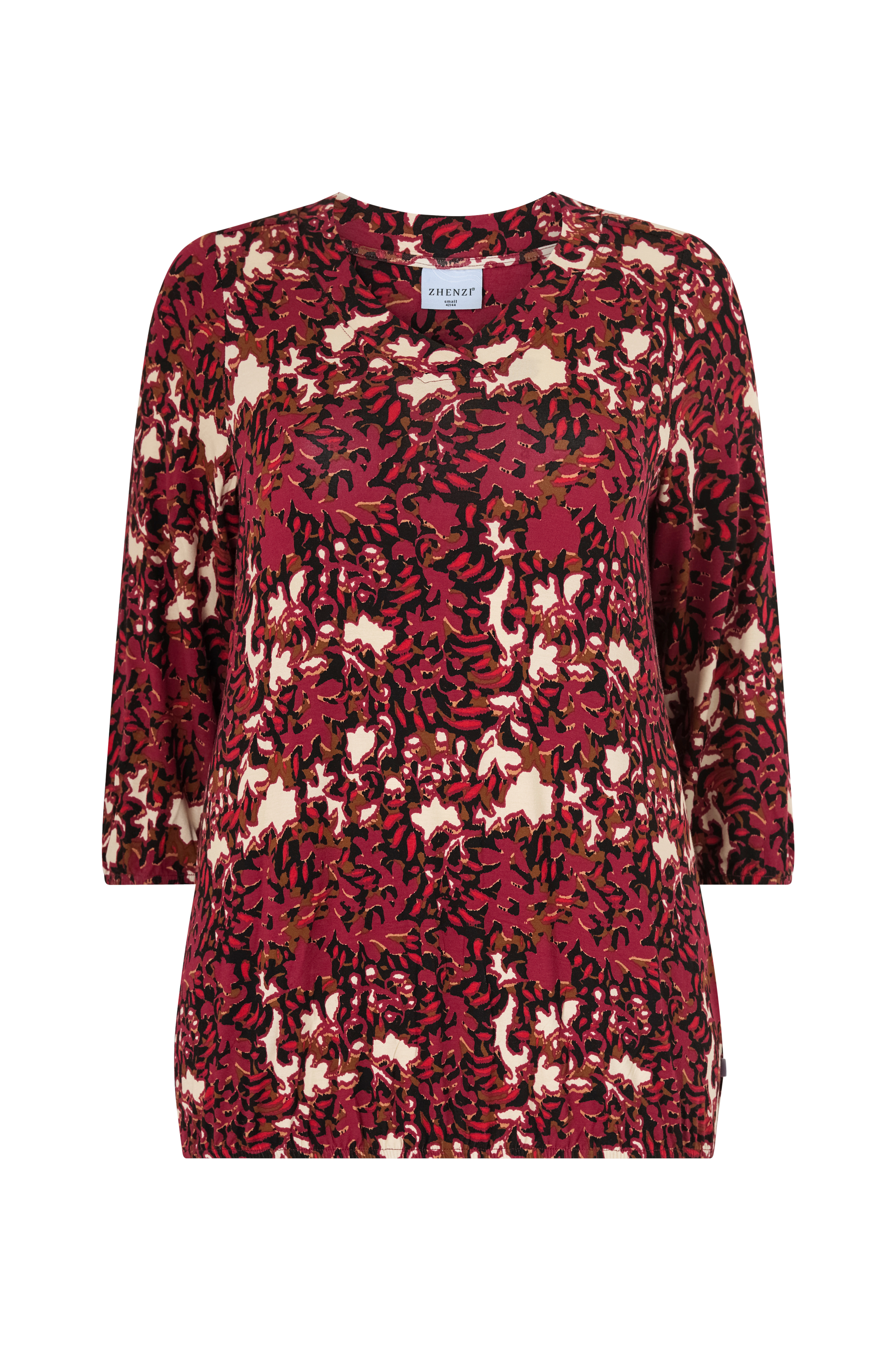 • Mønstret top med bølgeformet, v-formet halsudskæring• 3/4 lange ærmer med elastik ved manchetterne• Elastisk model med elastik ved nederste kant• Store størrelser