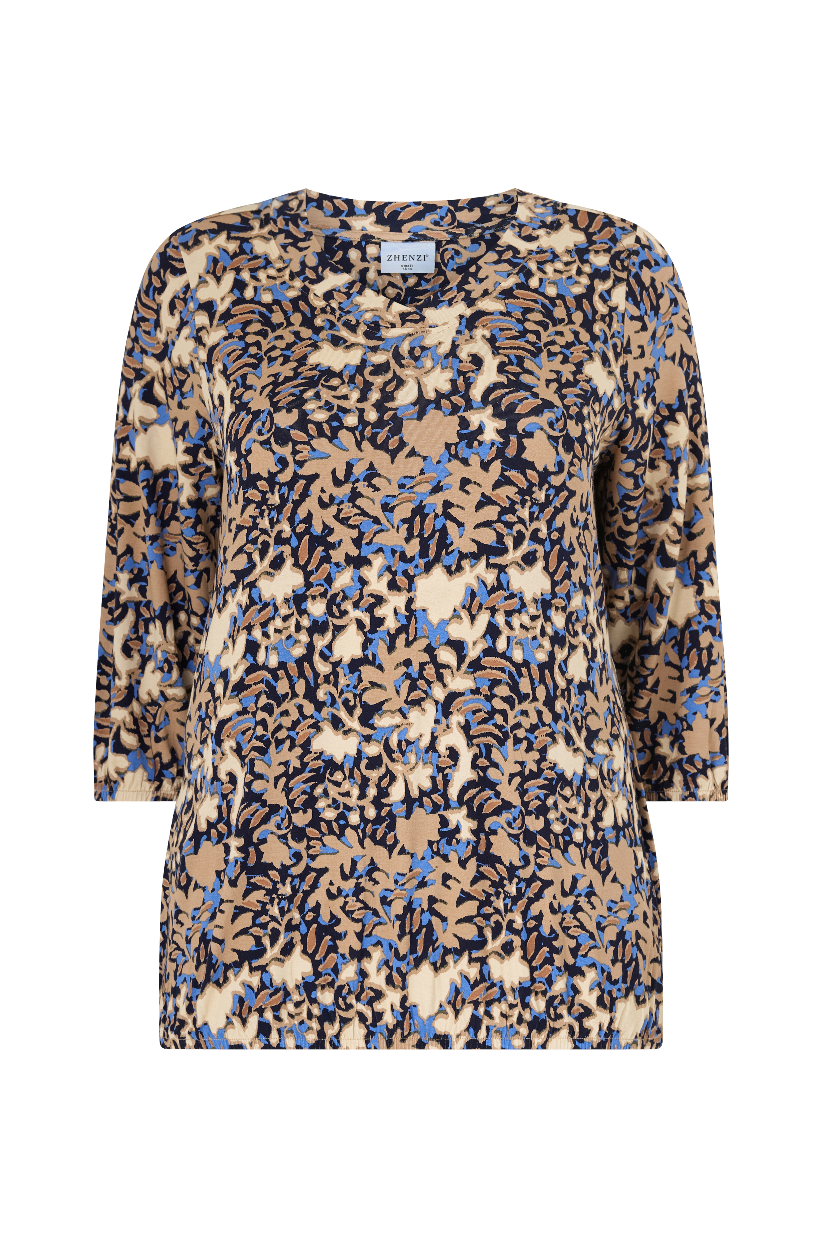 • Mønstret top med bølgeformet, v-formet halsudskæring• 3/4 lange ærmer med elastik ved manchetterne• Elastisk model med elastik ved nederste kant• Store størrelser