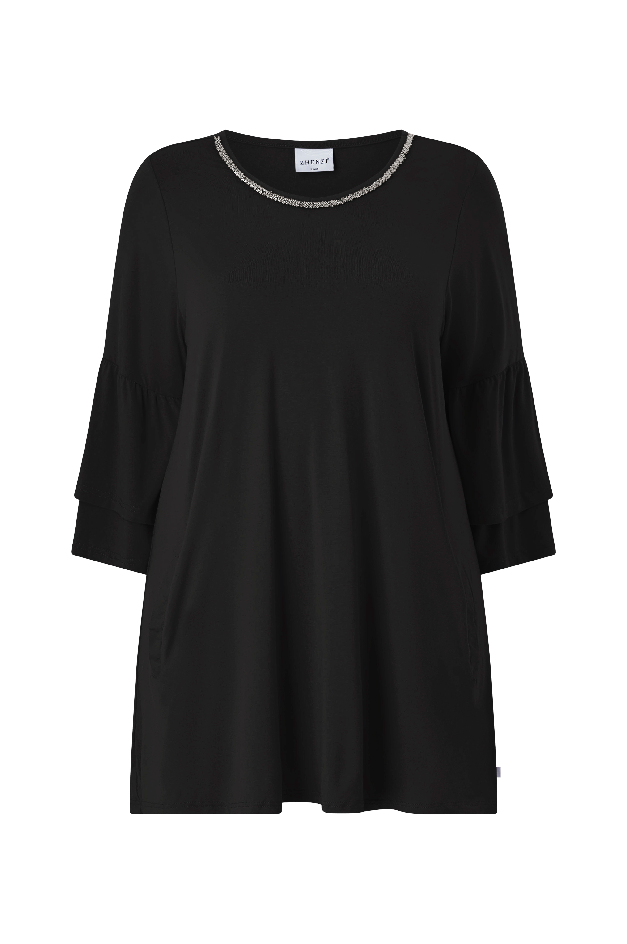 • Store størrelser• Lige model i jersey• Bred halsudskæring med broderede perler foran• Bredt ærme med svaj med volanter nederst• Indlagte lommer• Længde: 87 cm i størrelse S