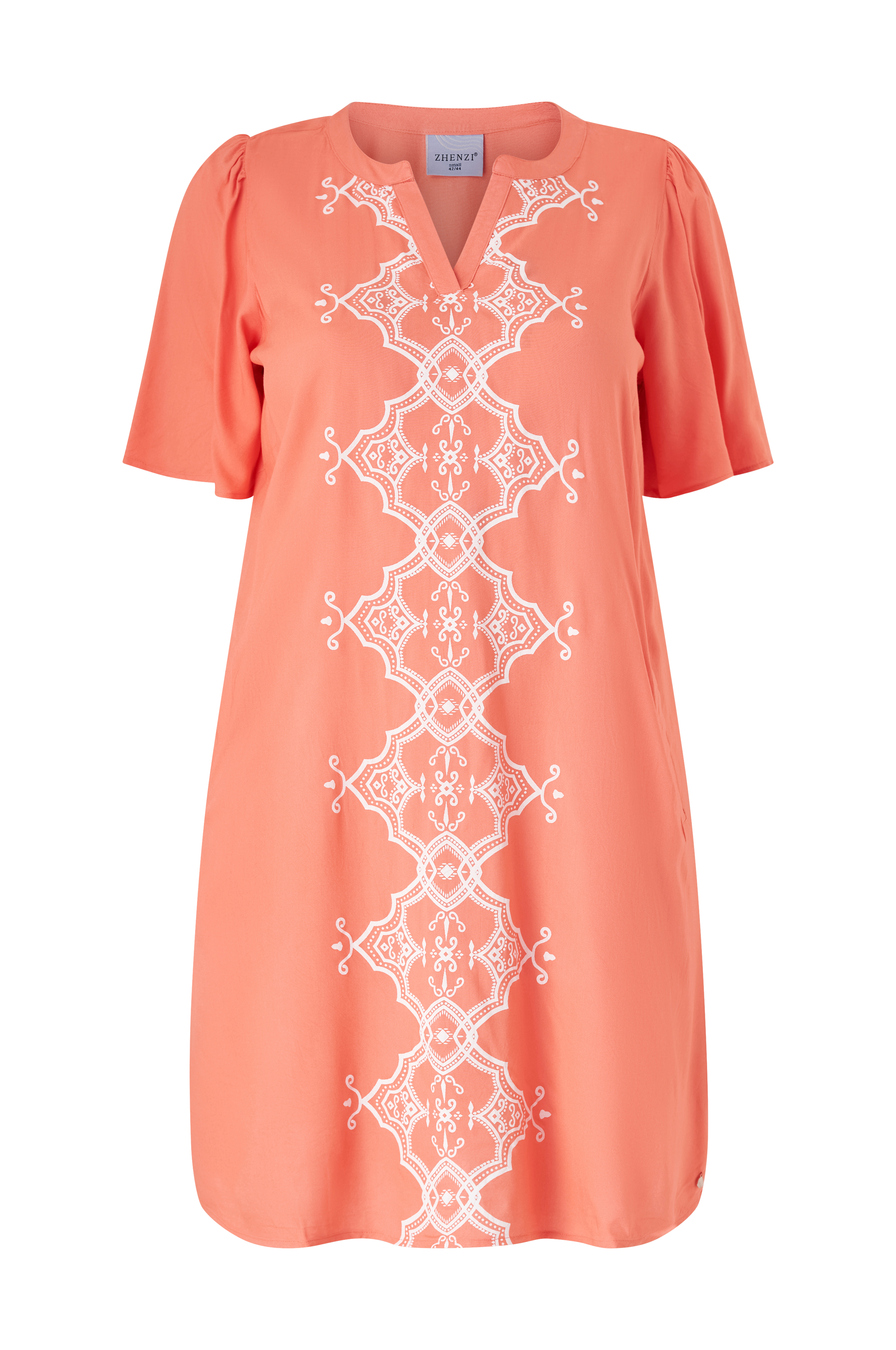 • Store størrelser• Model med svaj i blød viskose• Rund hals med ventilation foran• Kort, bredt ballonærme• Længde: 98 cm i størrelse 42/44
