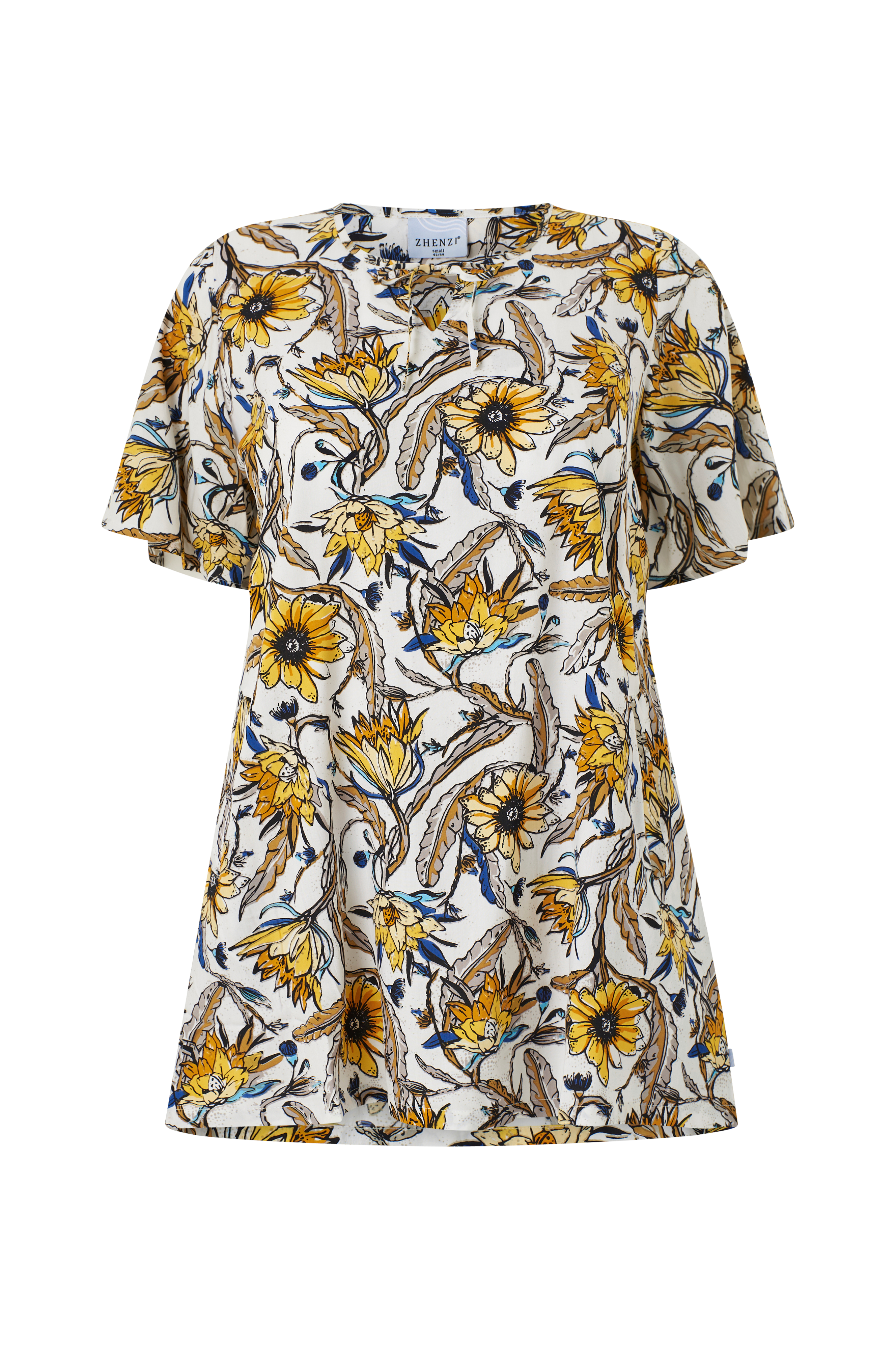 • Tunika i viskose med printet mønster• Rund hals• V-formet ventilation foran med bindebånd• Kort sommerfugleærme• Store størrelser• Længde: 84 cm i størrelse S
