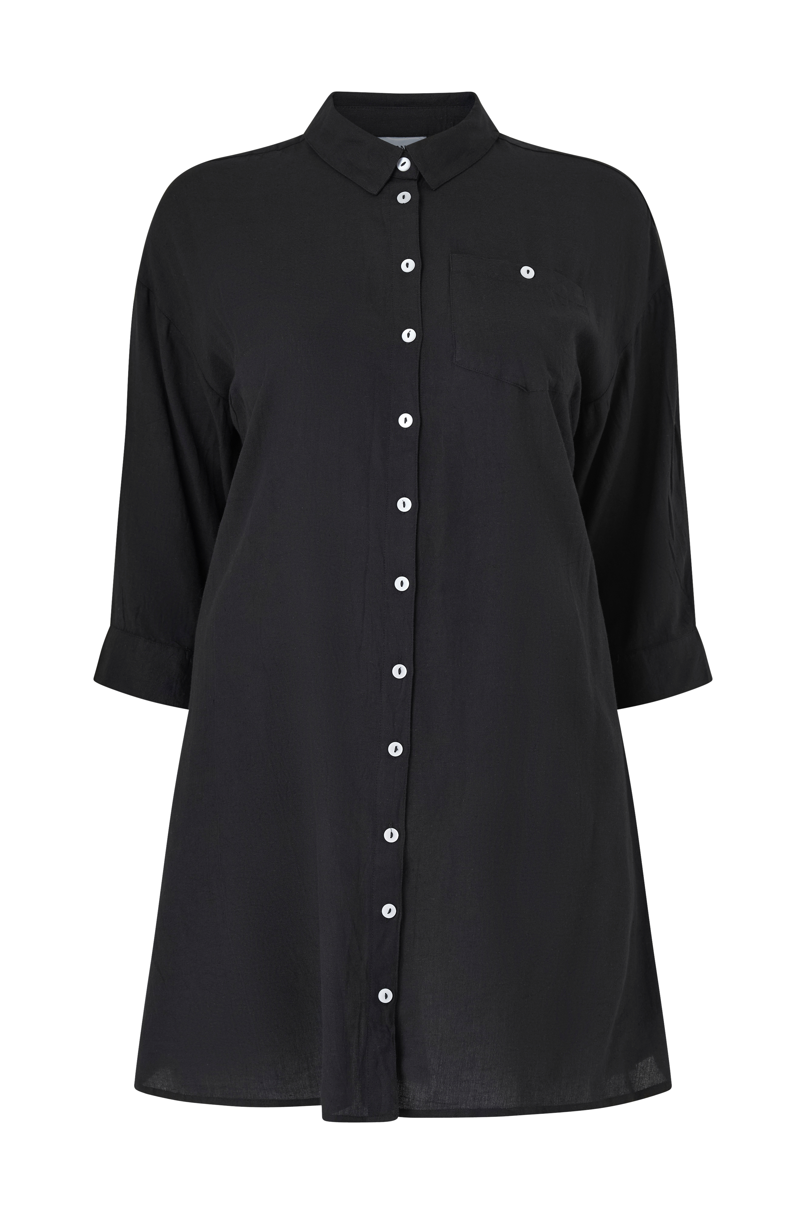 • Store størrelser• Skjortemodel med svaj• Lille krave• Knapper hele vejen frem• Nedsænket skulder• Lige, 3/4 langt ærme med manchet ved manchetterne• Længde: 95 cm i størrelse S