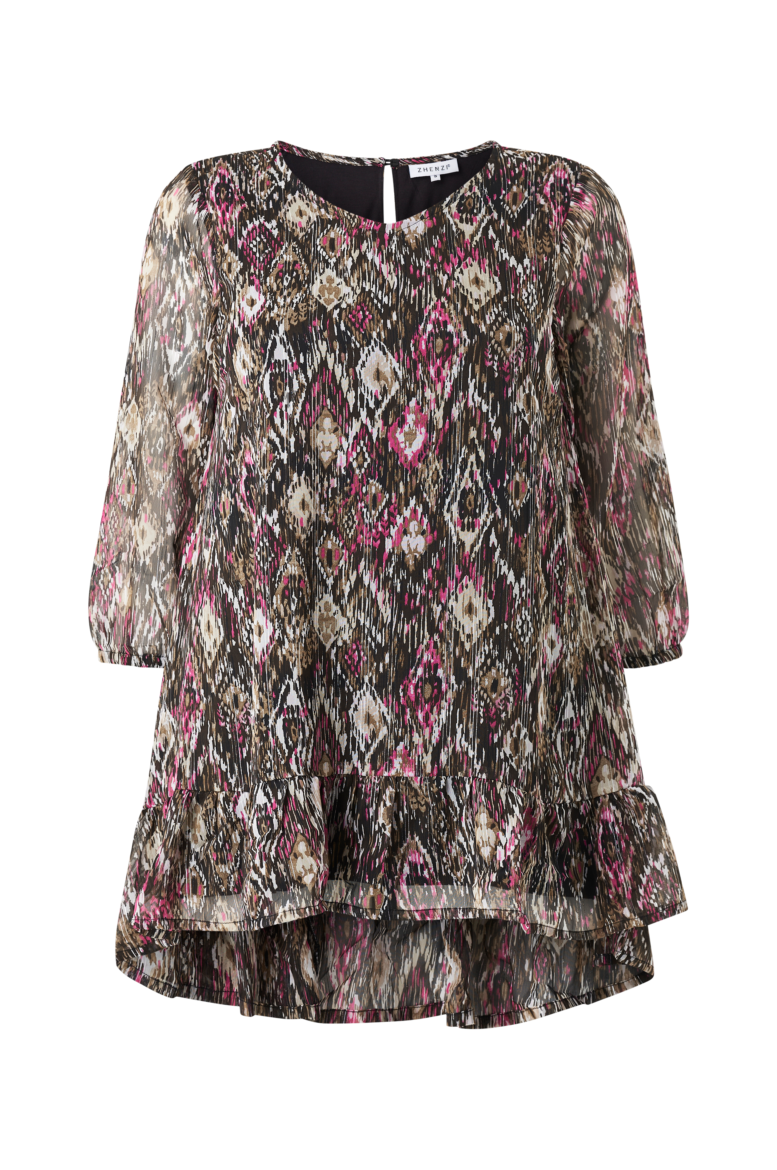 • Mønstret tunika i chiffon• V-udskæring• 3/4 lange, transparente ærmer• A-linje design• Volant nederst• Trikotfor• Store størrelser• Længde: 86 cm i størrelse S