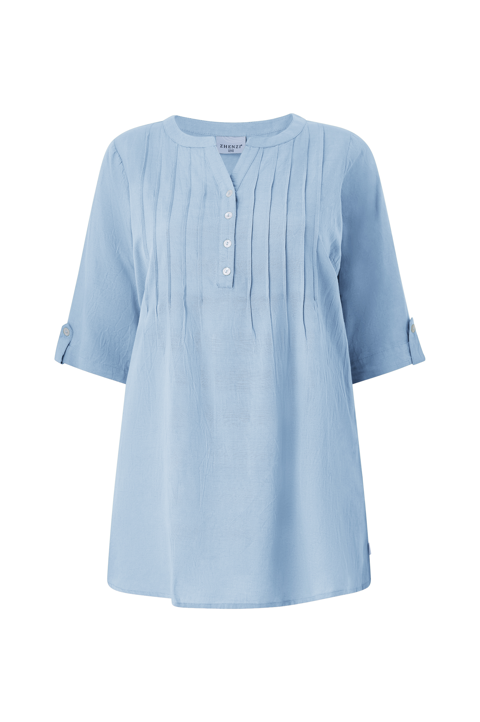 • Tunika i hørblanding• Knapper oppe foran• Syede biselæg• 3/4 lange ærmer• Plusstørrelser• Længde: 85 cm i størrelse S