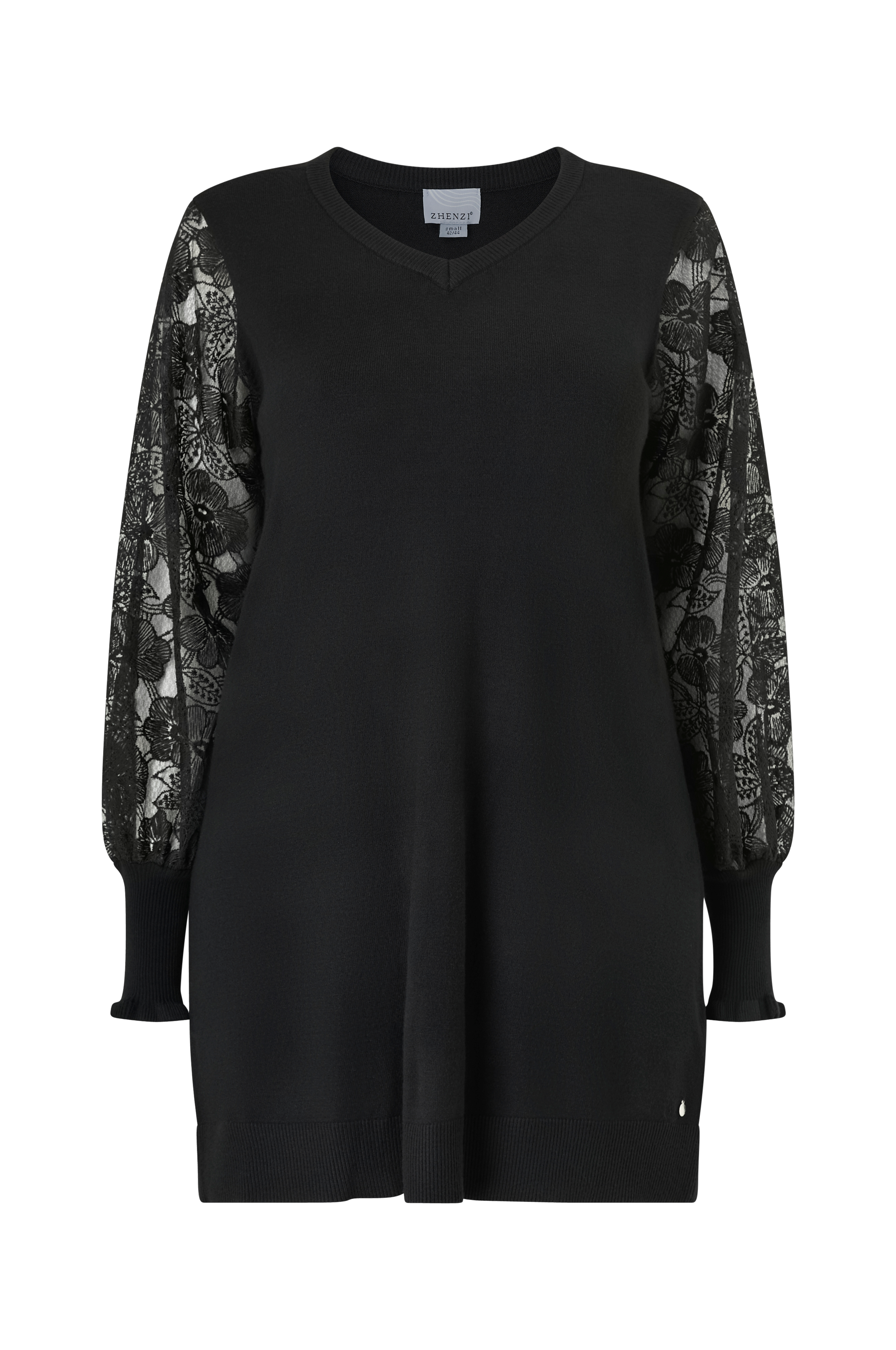 • Blød tunika • Ribbet v-udskæring • Lange ærmer i blonde • Ribmanchetter med lille flæsekant • Ribbet søm • Plusstørrelser • Længde: 89 cm i størrelse S