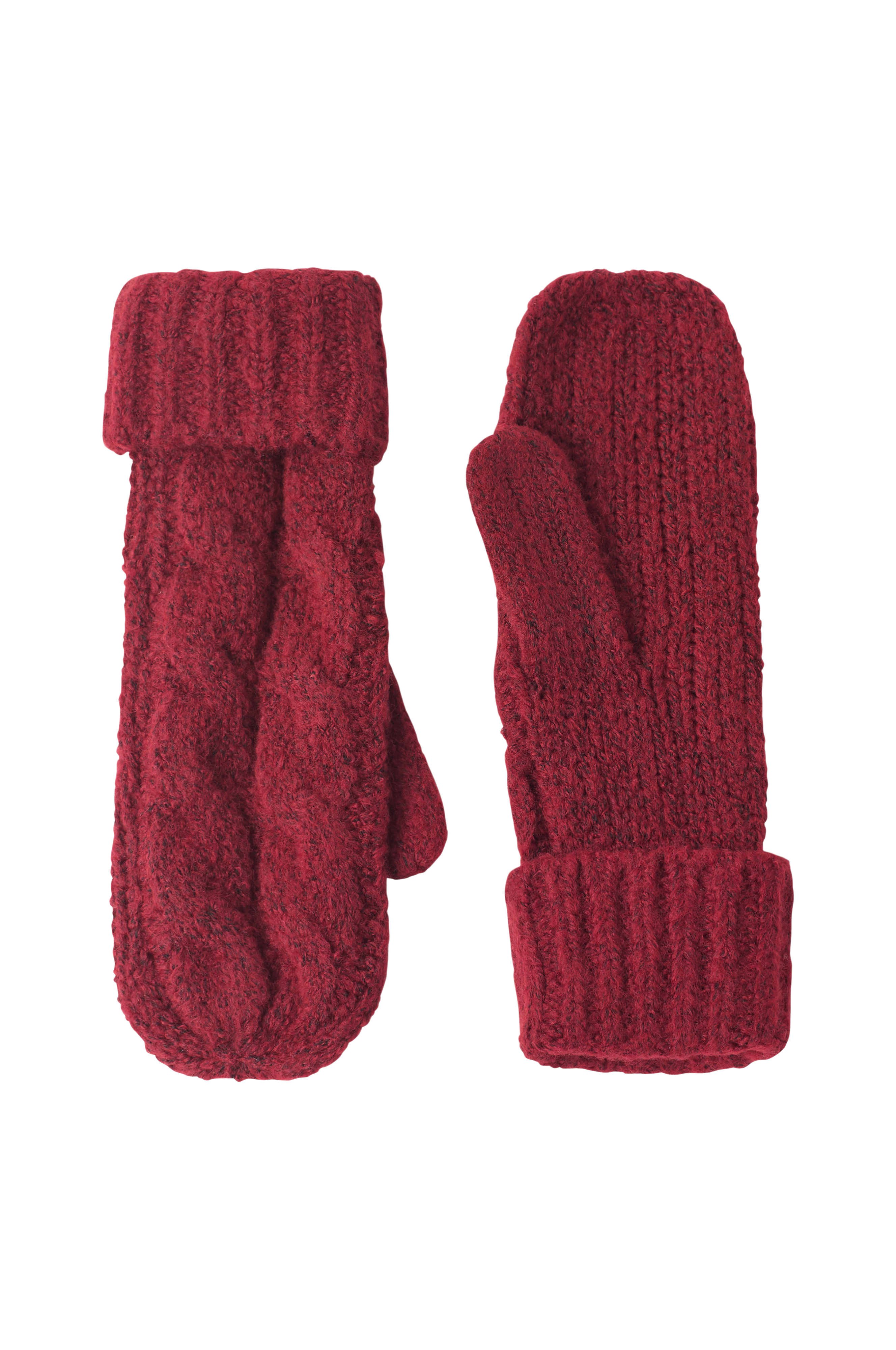• Strikkede vanter med kabelstrikning på oversiden• Nedadvendt, ribstrikket skaft