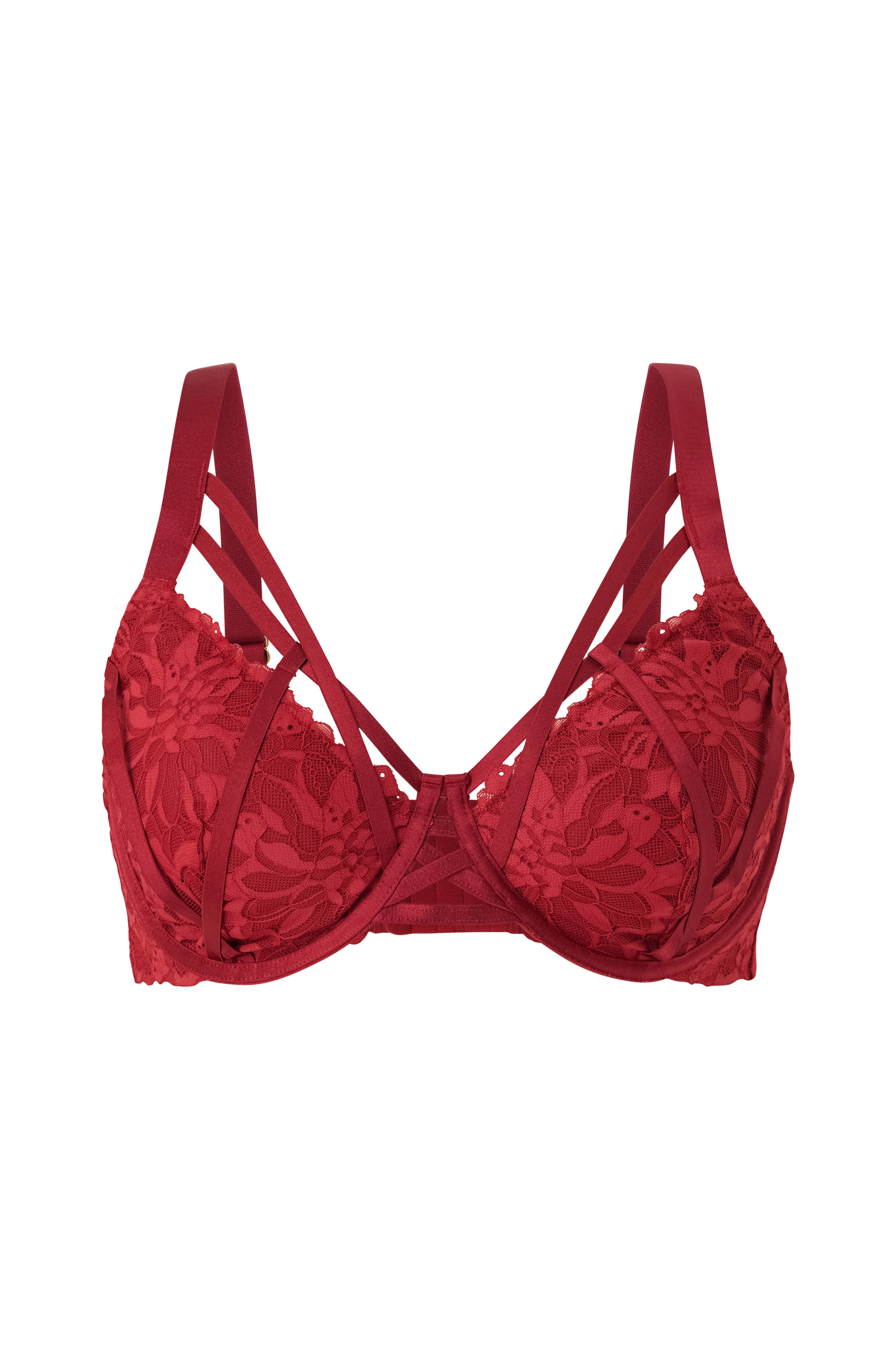 • Bh med bøjler i blomsterblonde med foret skål• Hægtelukning i ryggen• Justérbar skulderstrop med guldfarvet detalje• Dekorativt design foran med bånd i elastik• Stor størrelse