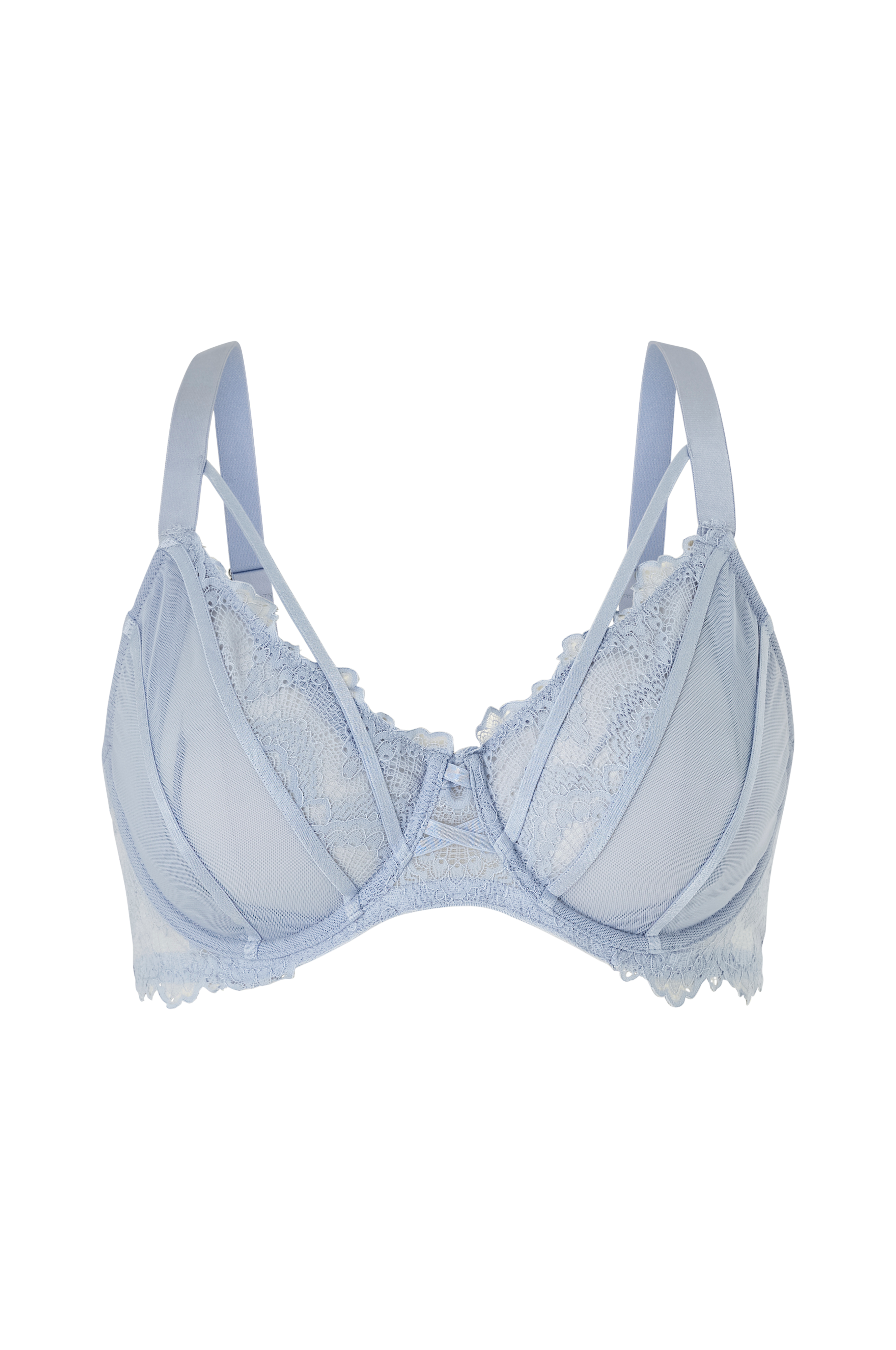 • Bh med bøjler med meshcups og blondedesign• Dekorativ, bølget blondekant nederst• Justérbare skulderstropper• Hægtelukning i ryggen• Store størrelser