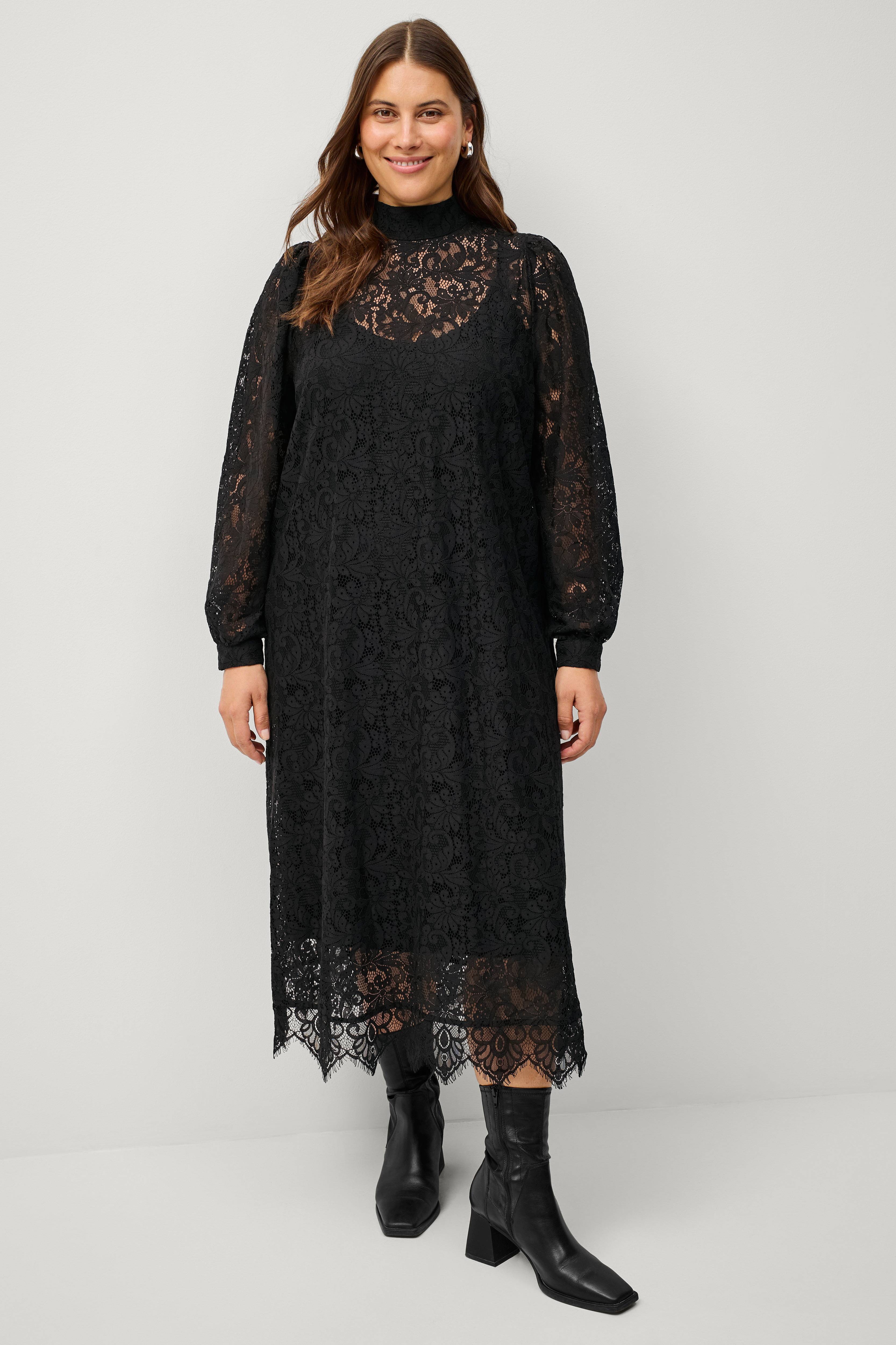 • Langærmet blondekjole• Løs pasform• Halsudskæring med skjult lynlås bagpå• Transparente ærmer med knap ved manchetterne• Petticoat i viskosejersey• Store størrelser• Længde: 127 cm i størrelse S