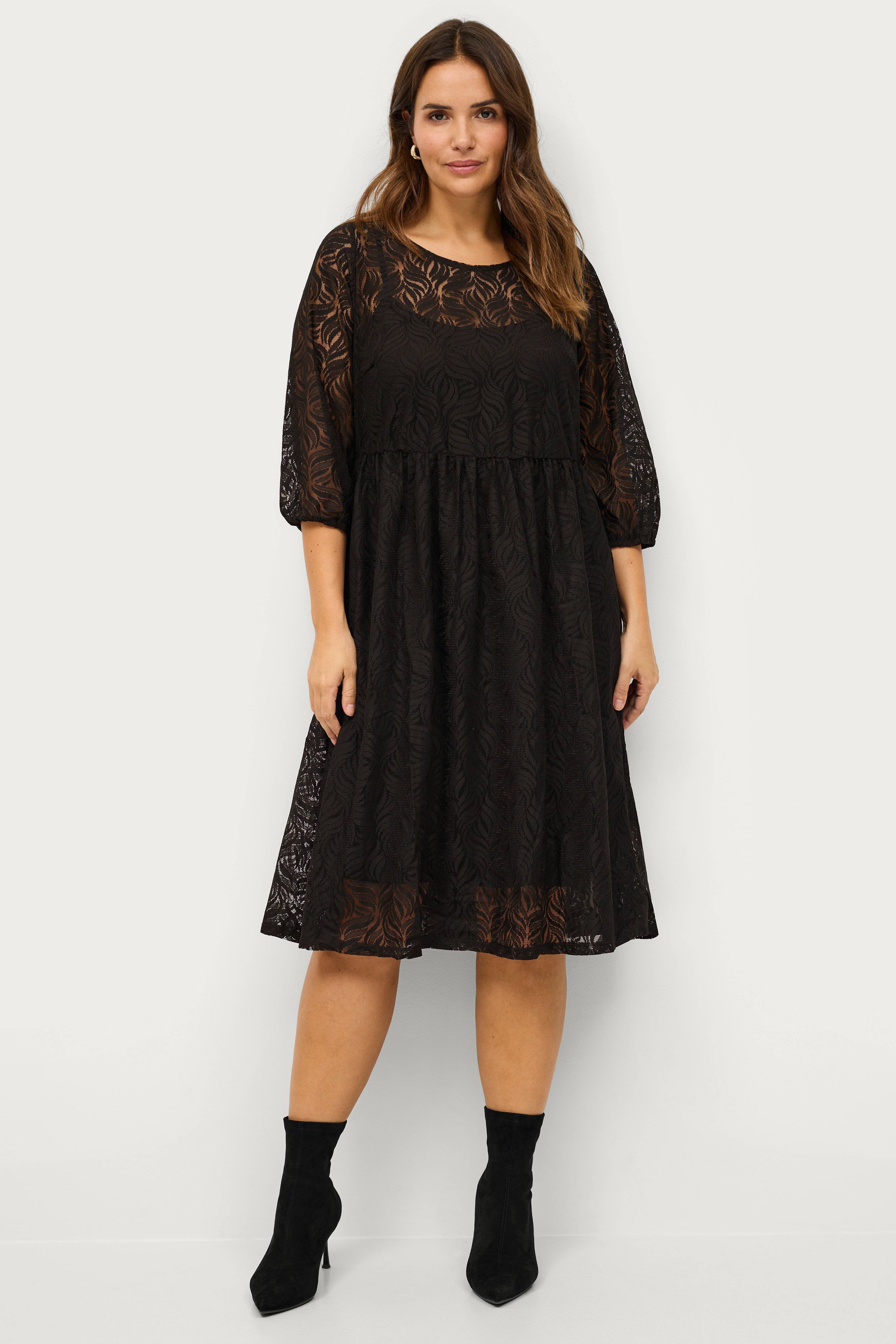 • Transparent kjole i blonde• 3/4 lange ærmer• Elastisk talje• Ventilation med knap i nakken• Underkjole i jersey• Store størrelser• Længde: 110 cm i størrelse S