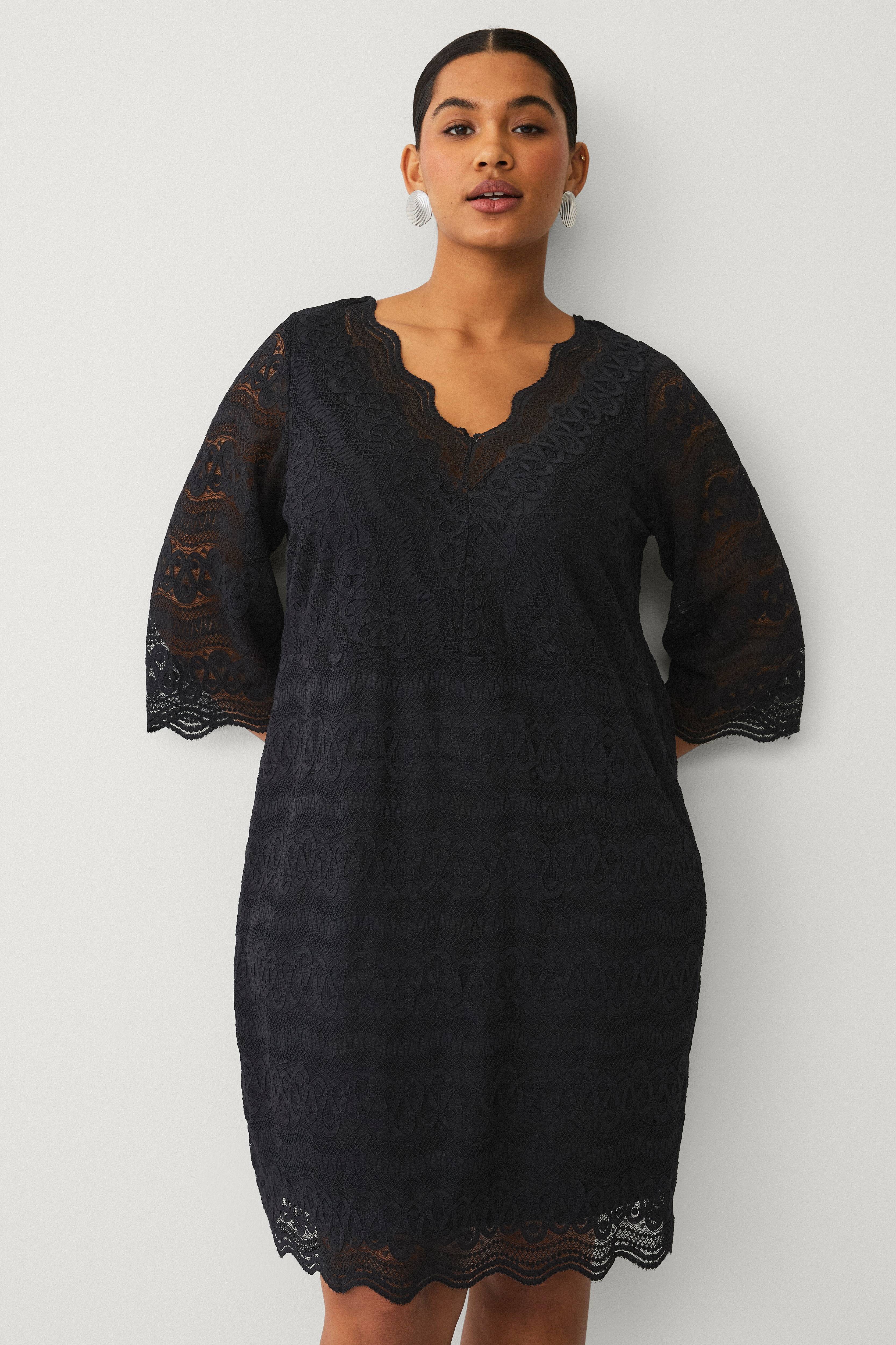 • Foret blondekjole• V-formet halsudskæring• 3/4 lange, uforede ærmer• Store størrelser• Længde: 101 cm i størrelse S