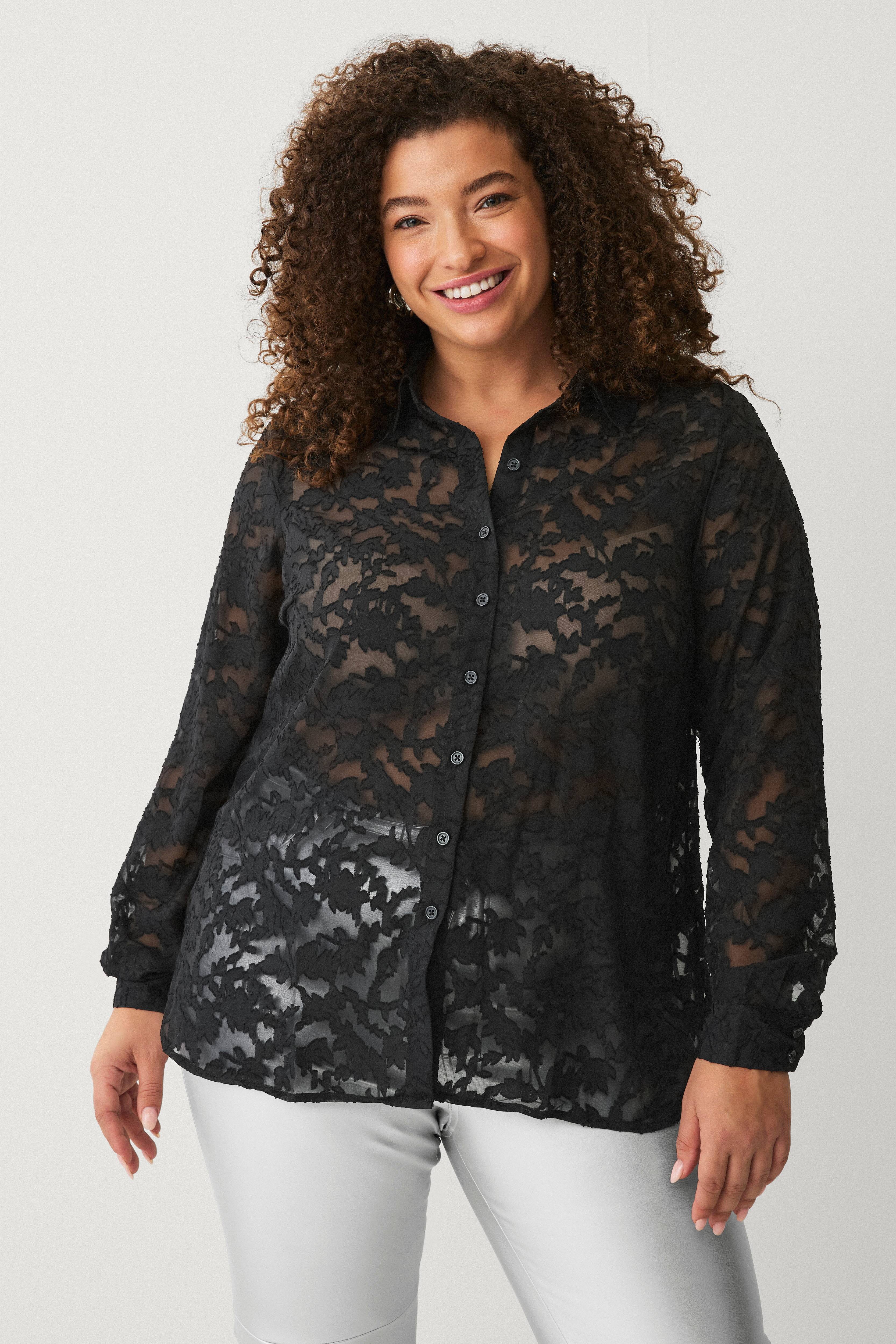 • Store størrelser• Jacquardvævet mønster i chiffon• Lille skjortekrave• Knapper foran• Langt ærme med manchet• Afrundede slidser nede i siderne