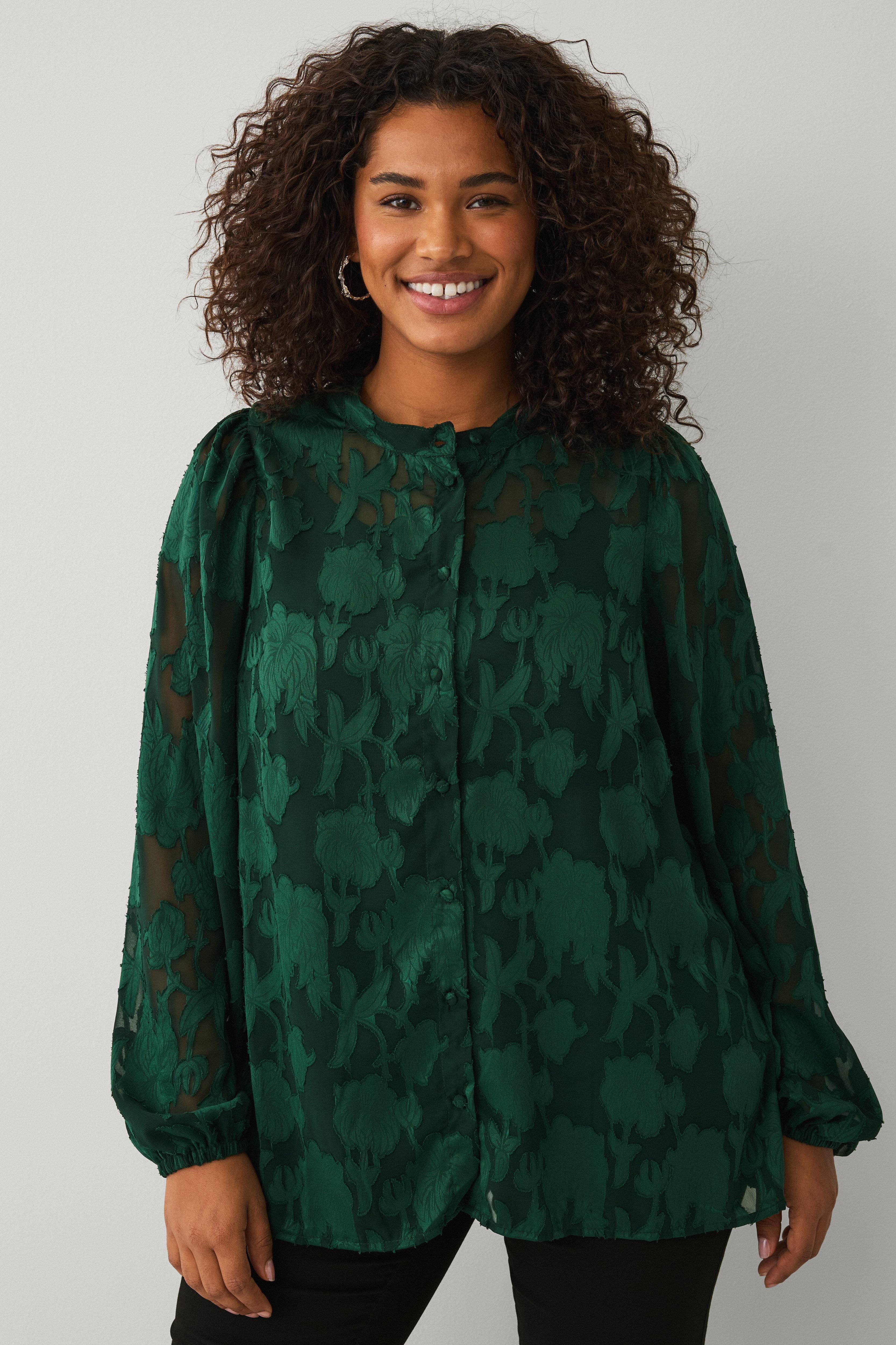 • Transparent, jacquardvævet bluse med beklædte knapper foran• Rund halsudskæring• Lange pufærmer med elastik ved manchetterne• Plusstørrelser