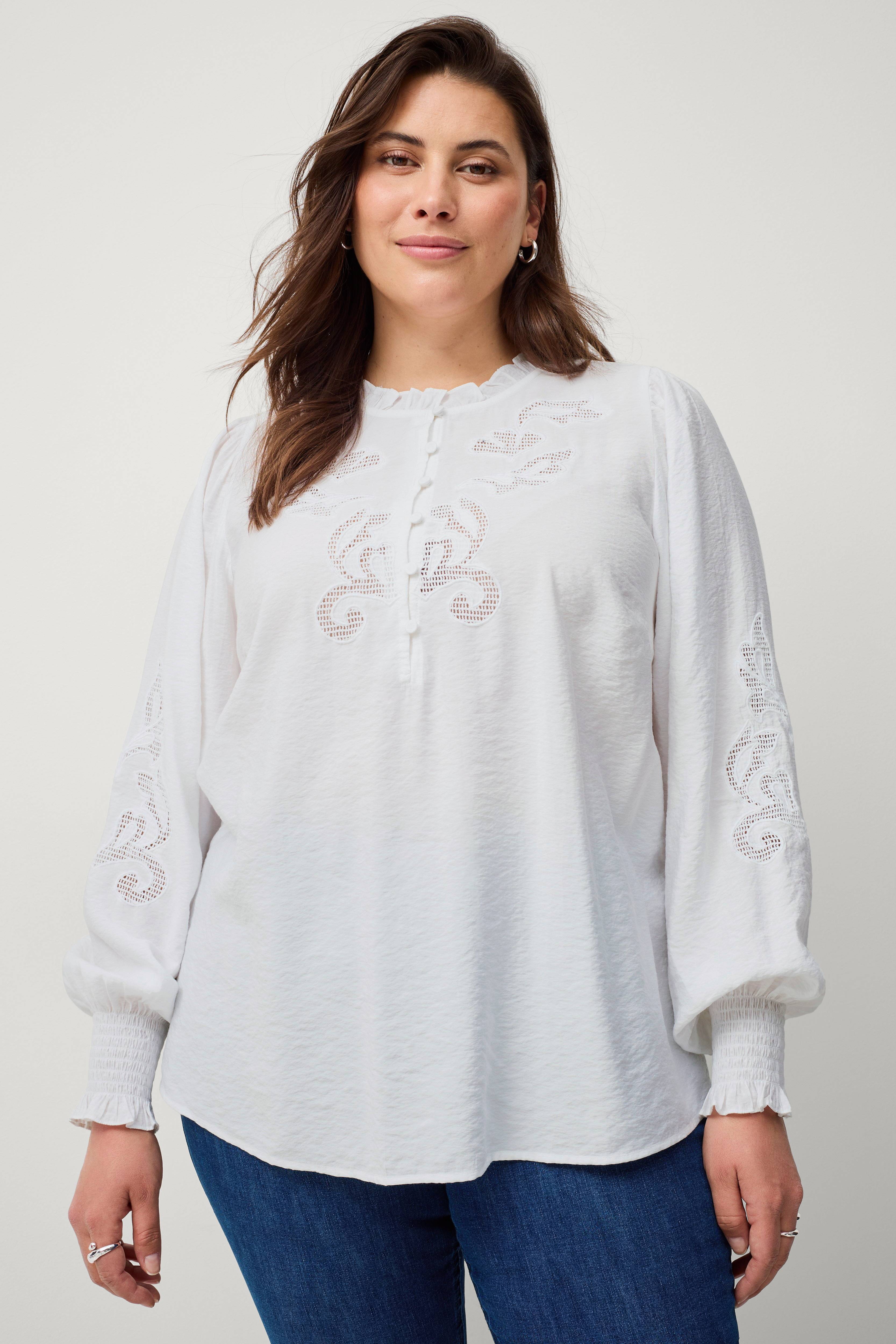 • Bluse med broderi foran og på ærmerne• Volant i halsen• Beklædte knapper oppe foran• Ballonærmer med smock ved manchetterne• Store størrelser