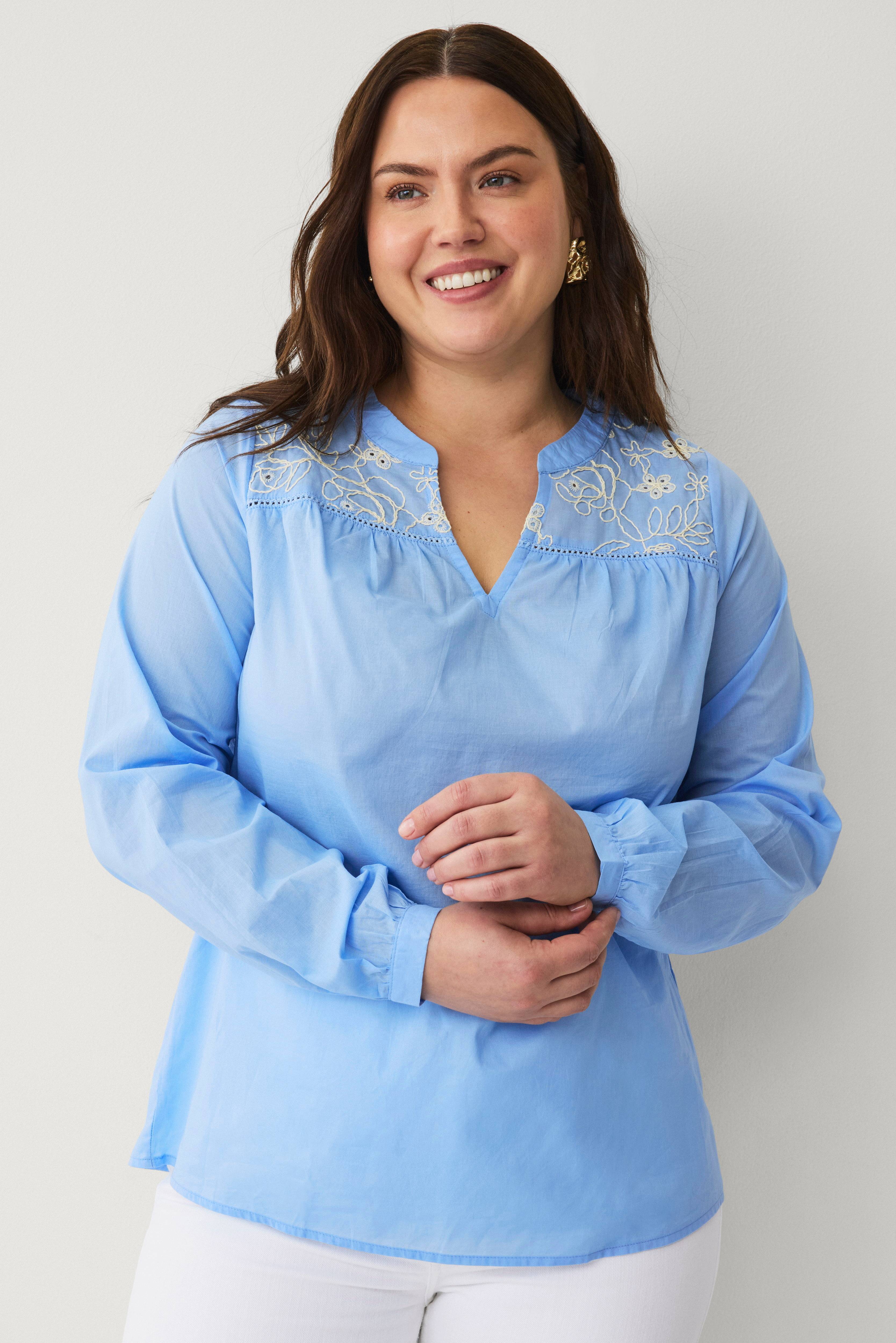 • Bluse i bomuld med v-formet halsudskæring• Broderede detaljer oppe foran med hulmønster og samling• Lange ærmer• Tynde manchetter med en knap• Store størrelser