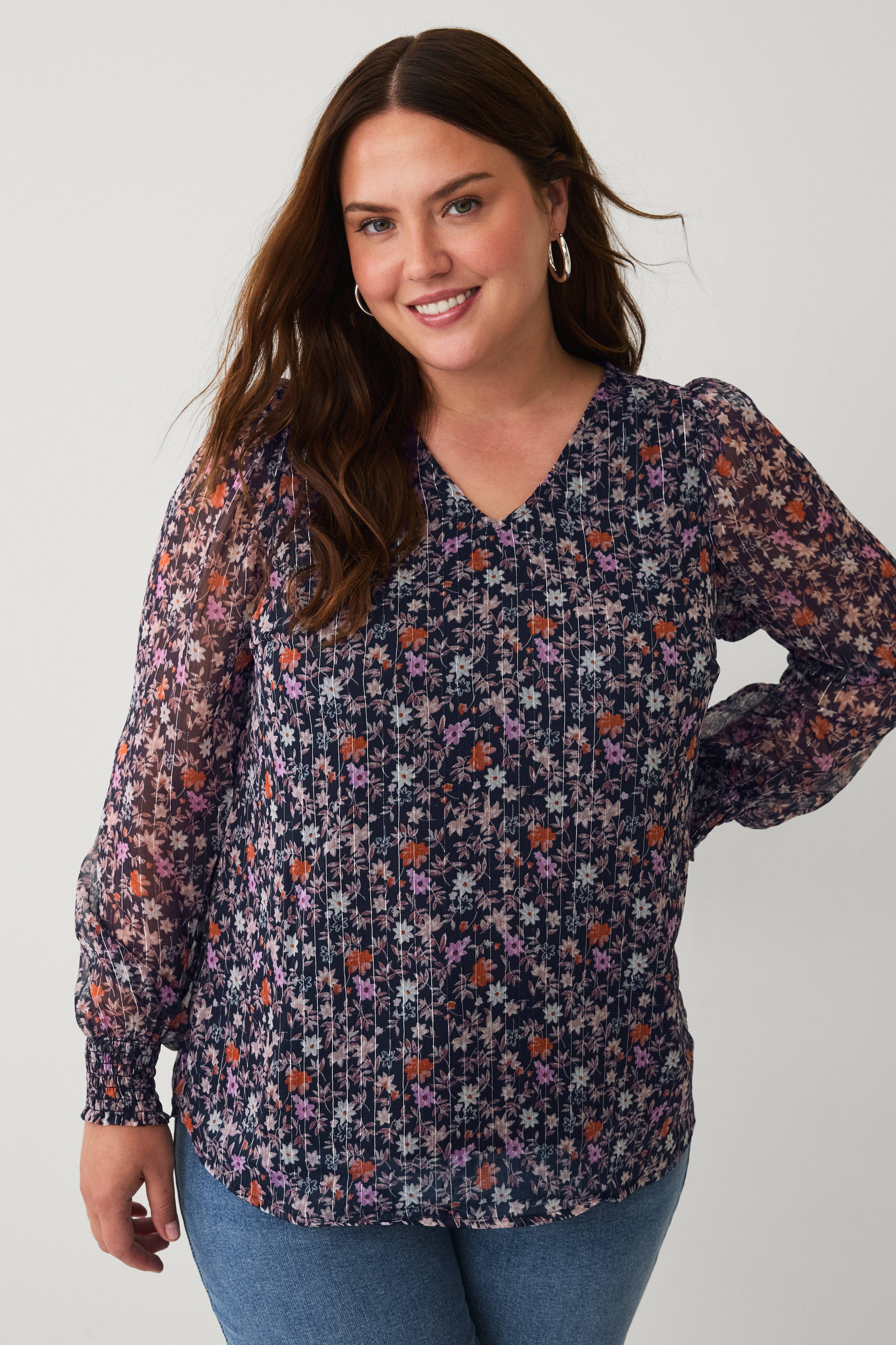 • Bluse i chiffon med et blomstermønster og glimmertråd• Tekstilforing• V-udskæring• Lange pufærmer• Smock ved manchetterne• Plusstørrelser