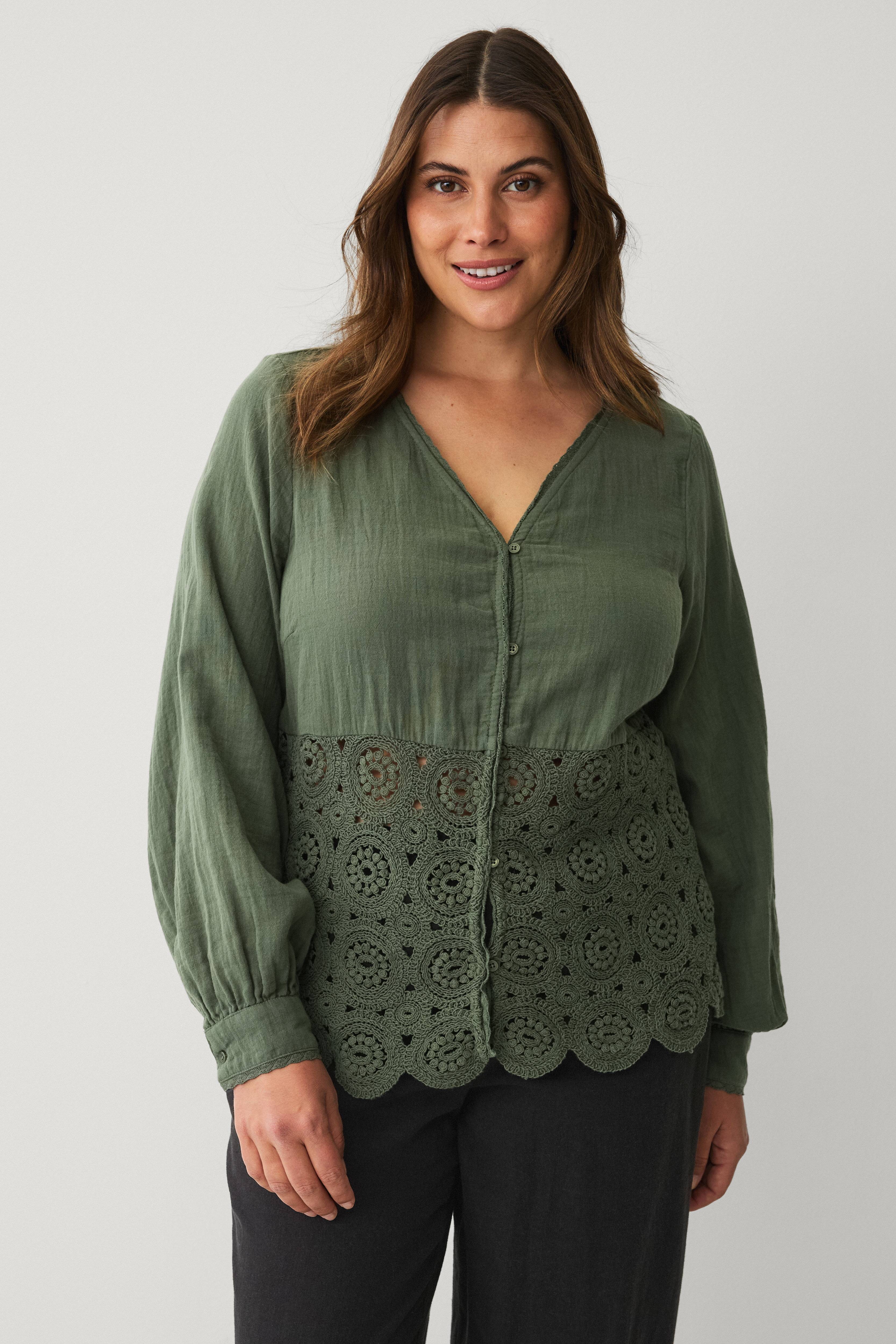 • Bluse i bomuldsmuslin• V-formet halsudskæring• Knapper hele vejen frem• Lange ballonærmer med manchet• Blondekant ved ærmeafslutningerne og rundt om halsudskæringen• Broderet nedre del med bølget kant• Stor størrelse