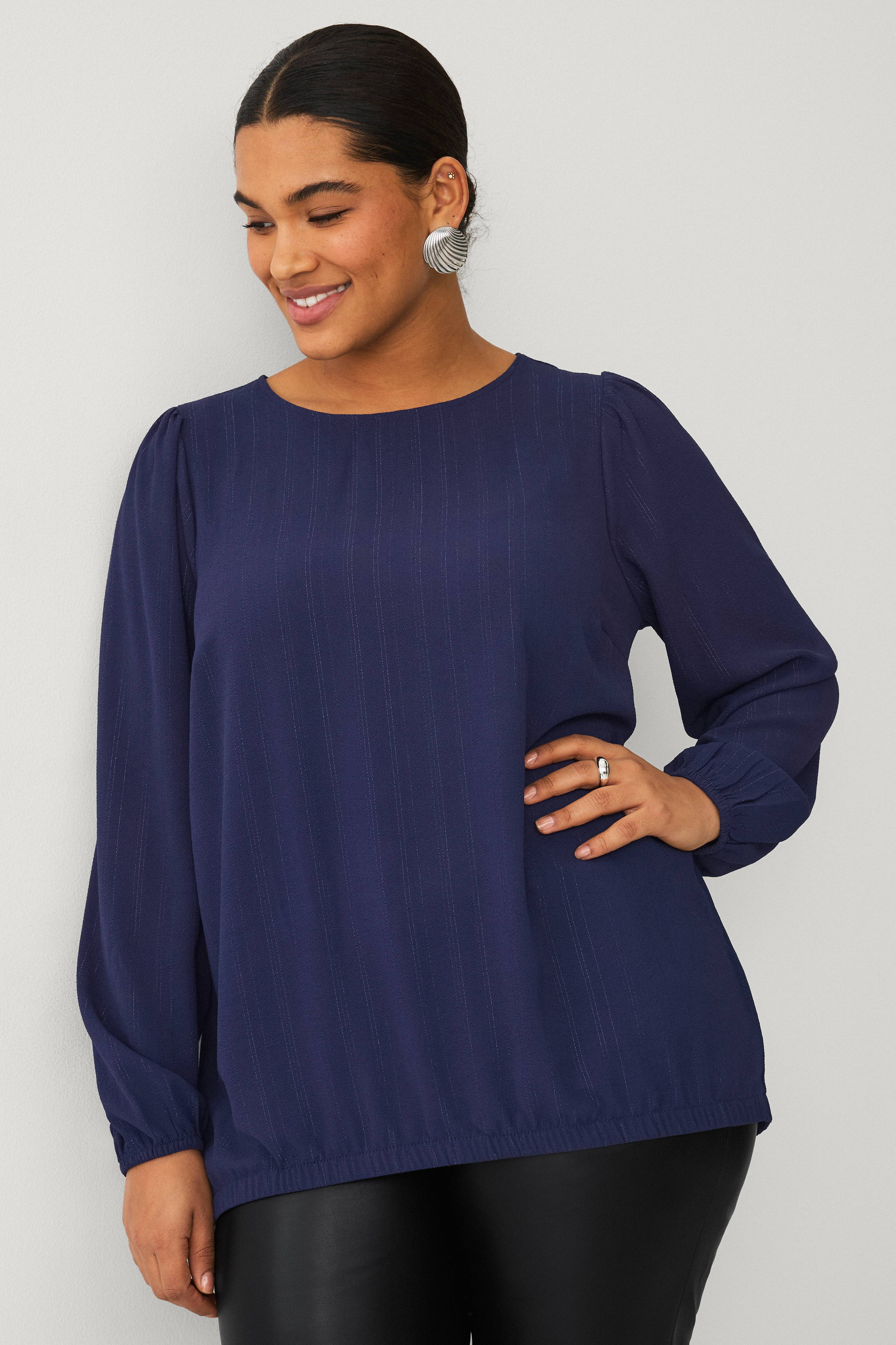 • Elastisk bluse med glitrende, smal stribe• Rund halsudskæring• Ventilation med knap i nakken• Lange ærmer med elastik ved manchetterne• Store størrelser