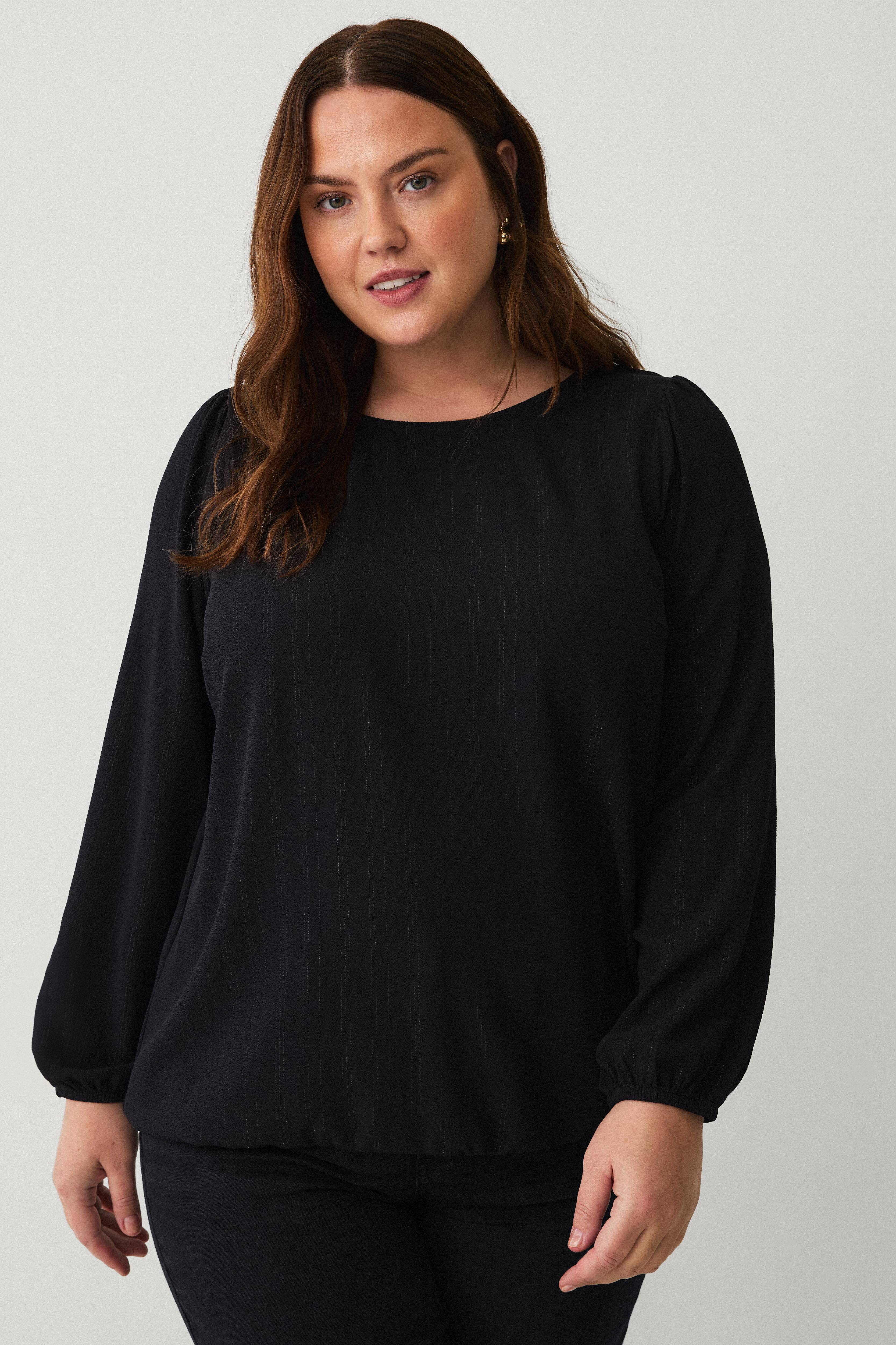 • Elastisk bluse med glitrende, smal stribe• Rund halsudskæring• Ventilation med knap i nakken• Lange ærmer med elastik ved manchetterne• Store størrelser