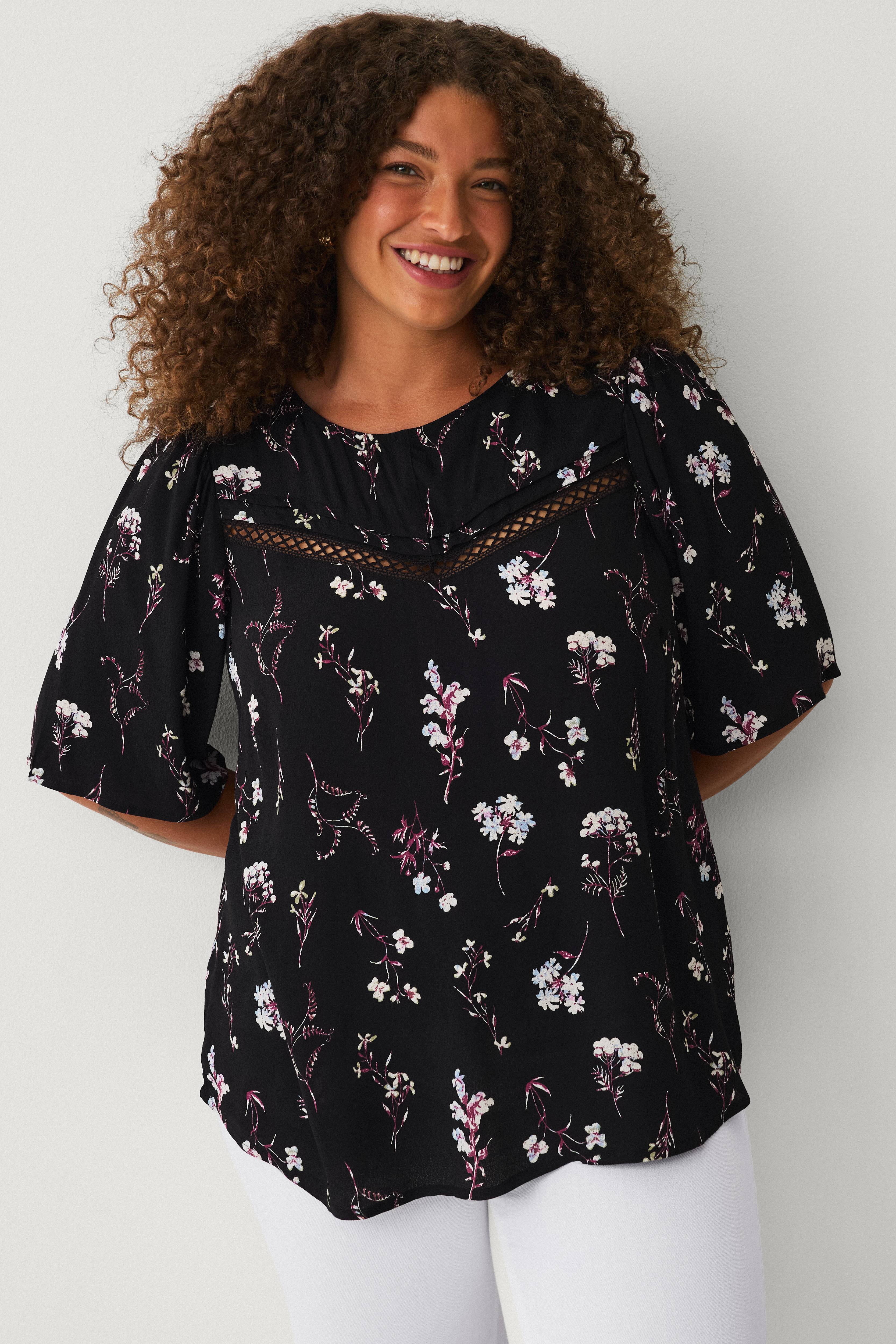 • Bluse i viskose med et blomstermønster• Rund halsudskæring• Korte pufærmer• Blondeindlæg på toppen• Store størrelser