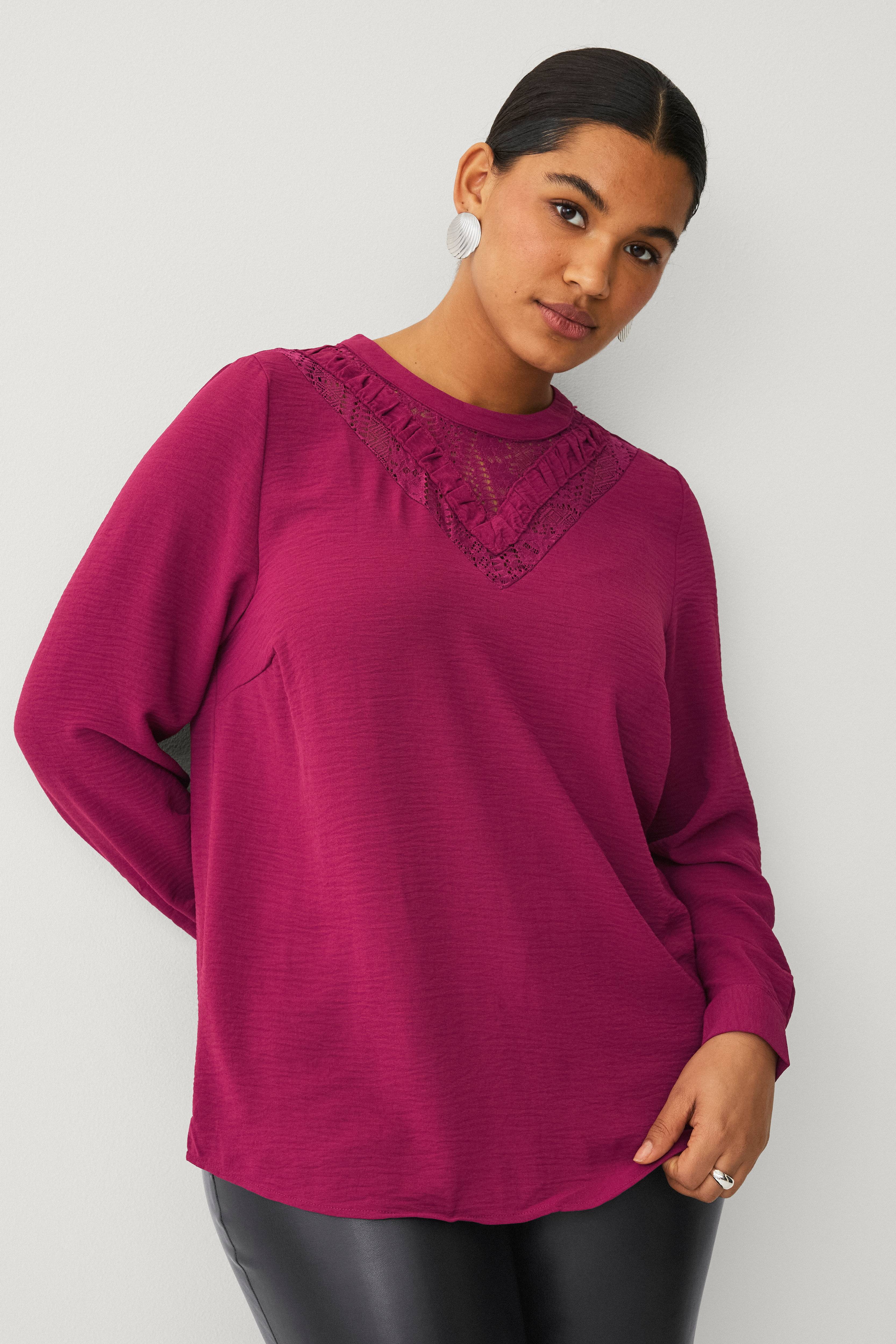 • Langærmet bluse med stræk• Dekorativ blondedetalje oppe foran• Rund halsudskæring• Ventilation med knap i nakken• To knapper ved manchetterne• Store størrelser