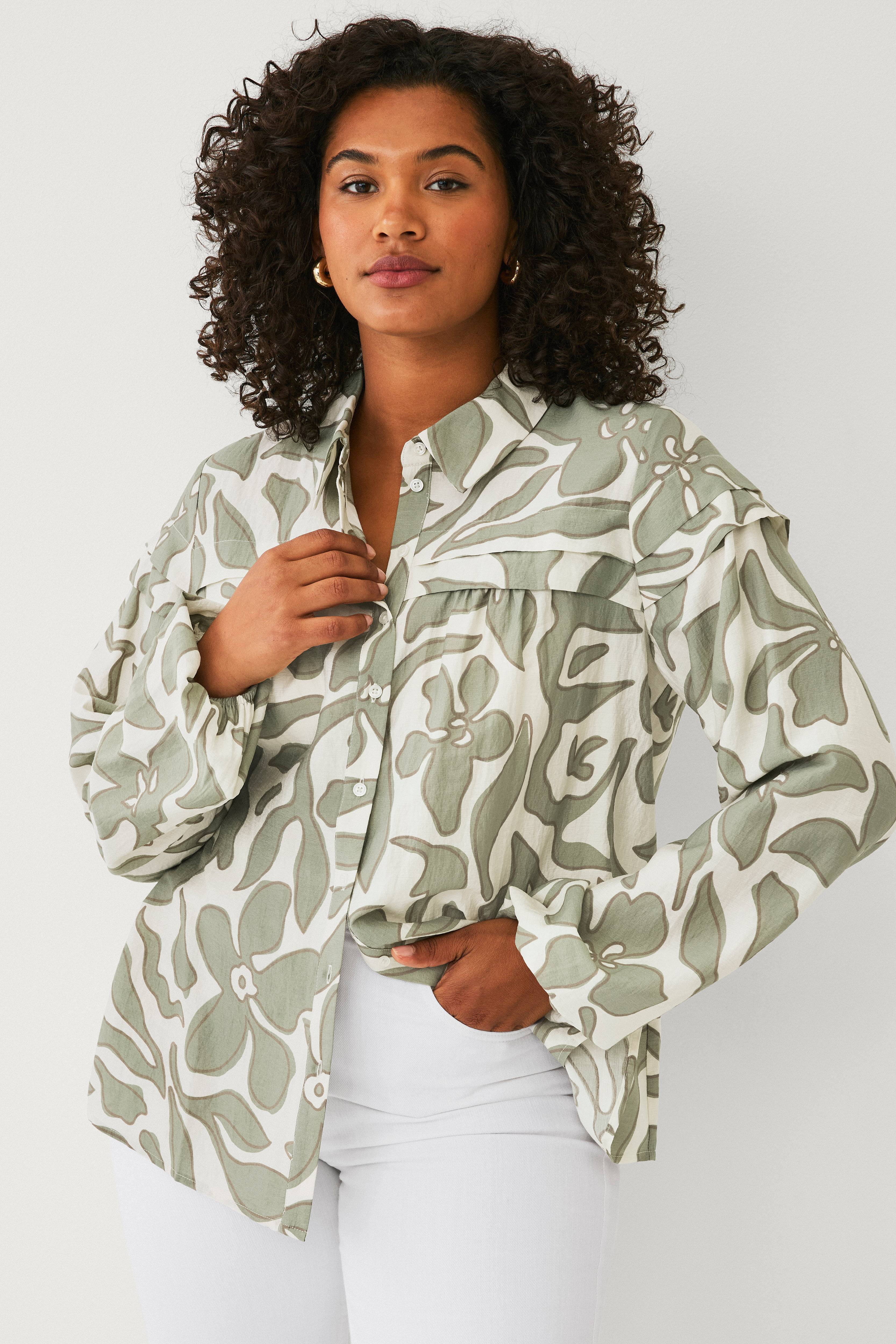 • Store størrelser• Uformel model• Syede bokslæg på brystet og på ærmerne• Knapper hele vejen frem• Langt ærme med elastik ved manchetterne