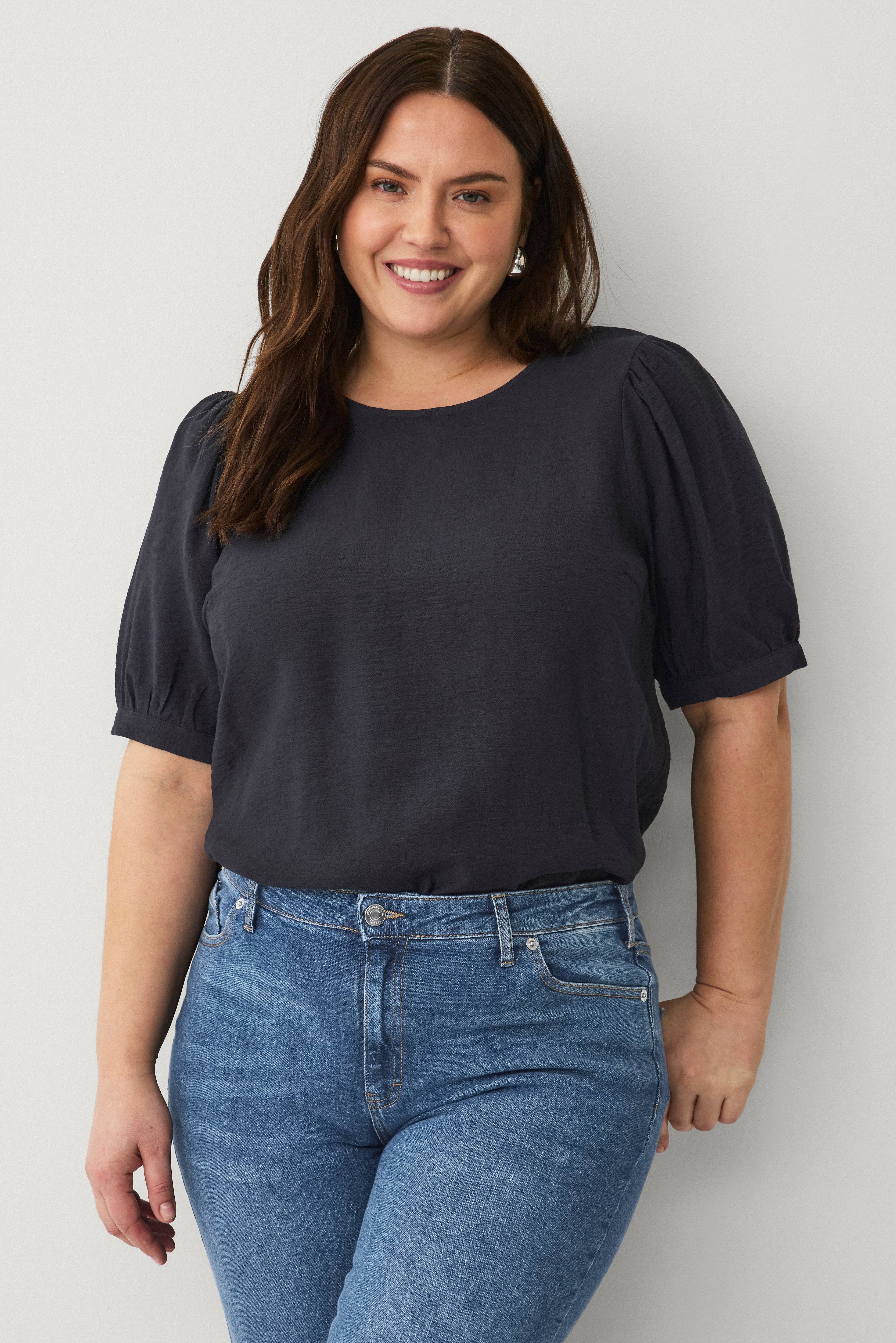 • Bluse i viskose• Nøglehulsåbning i nakken med knap• Halvlange ballonærmer• Stof med let struktur• Store størrelser• Rund halsringning