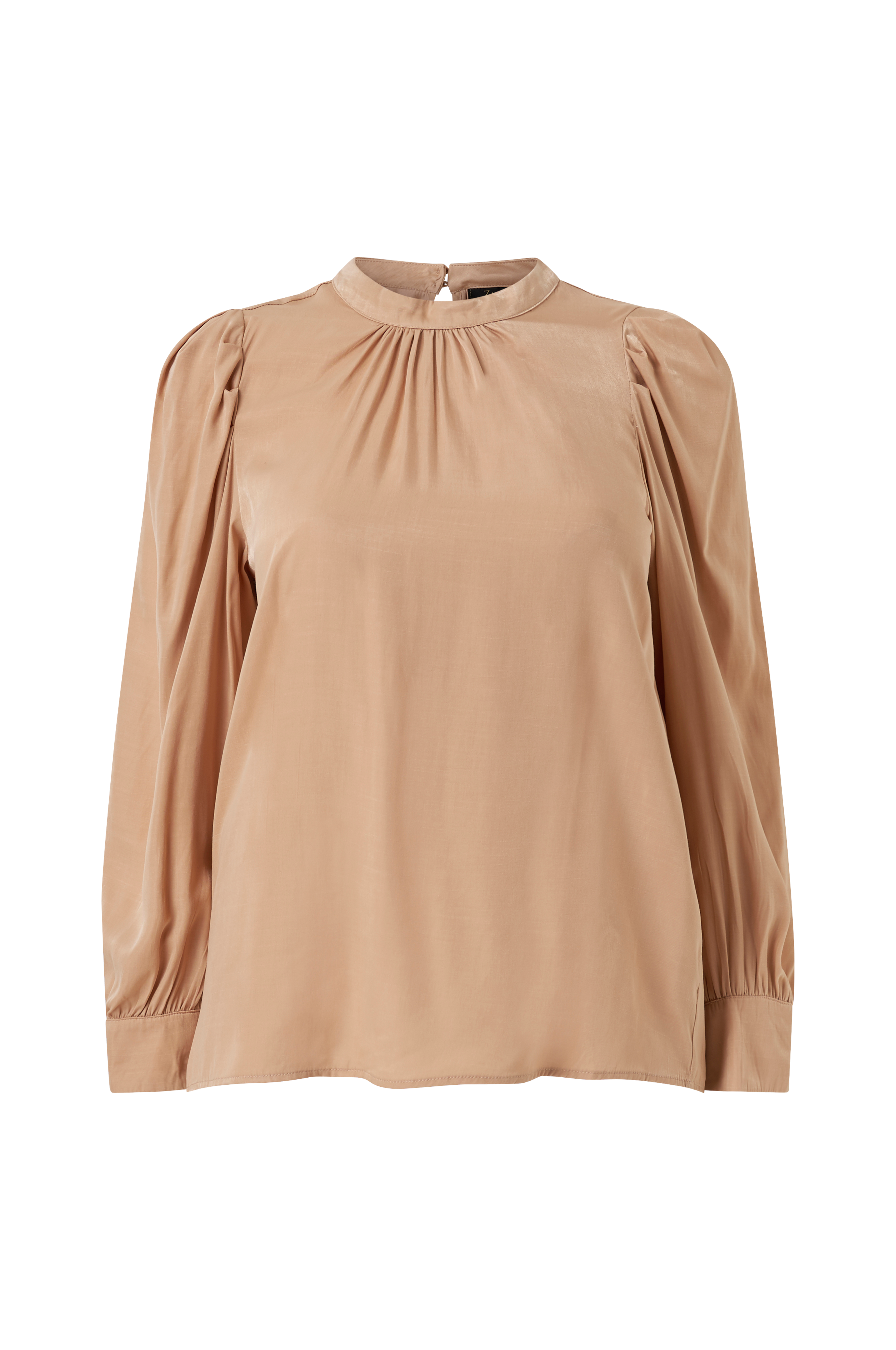 Bluse yPerla L/S Shirt fra Zay. Lige model i vævet satin med vidt pufærme som har lagte læg ved skulderen og bred manchet i ærmekant. Rund hals med rynk foran og slids med knap i nakken.