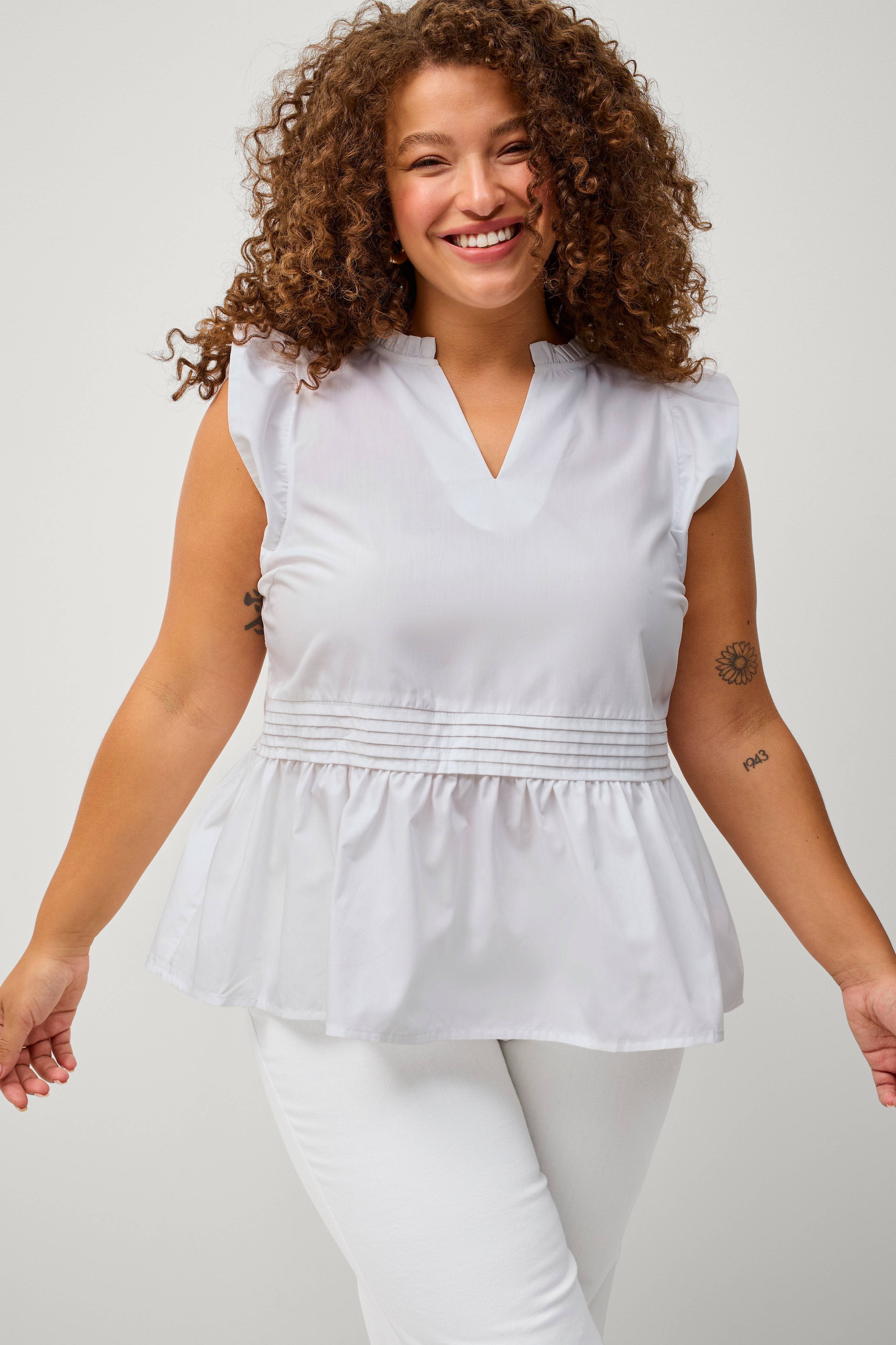 • Store størrelser• Peplumdesign• Rund hals med lille volant og ventilation foran• Volanter over skuldrene• Syede biselæg foran på taljen