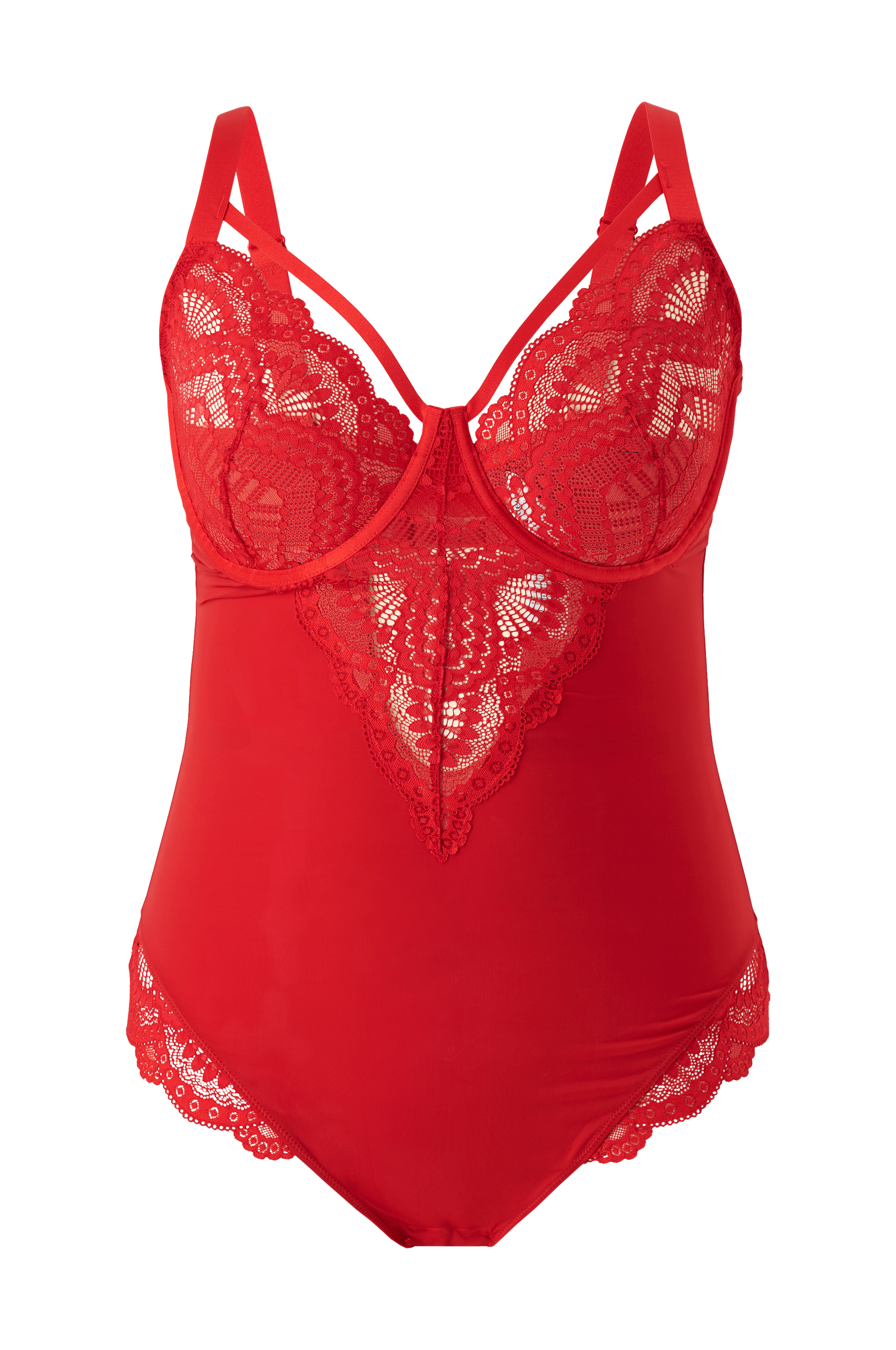 • Bodystocking i jersey med blondedetaljer • Blondecups med bøjle • Dekorative stropper foran • Bred hægtelukning i ryggen • G-streng design • Foret skridt med trykknapper