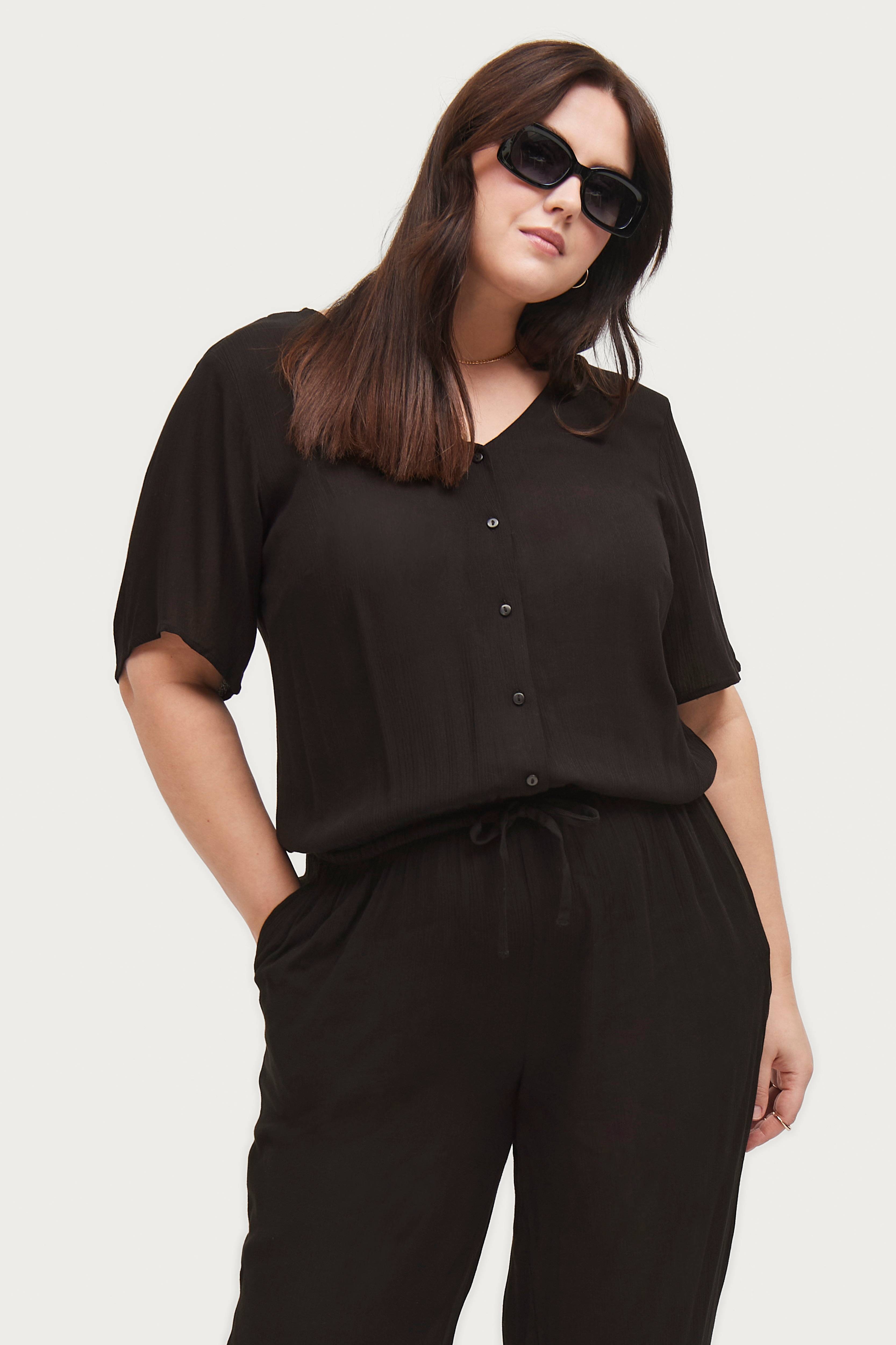 • Knapper foran• Korte ærmer• Elastisk talje med træksnørre• Lommer i siderne• Rynket kvalitet• Store størrelser