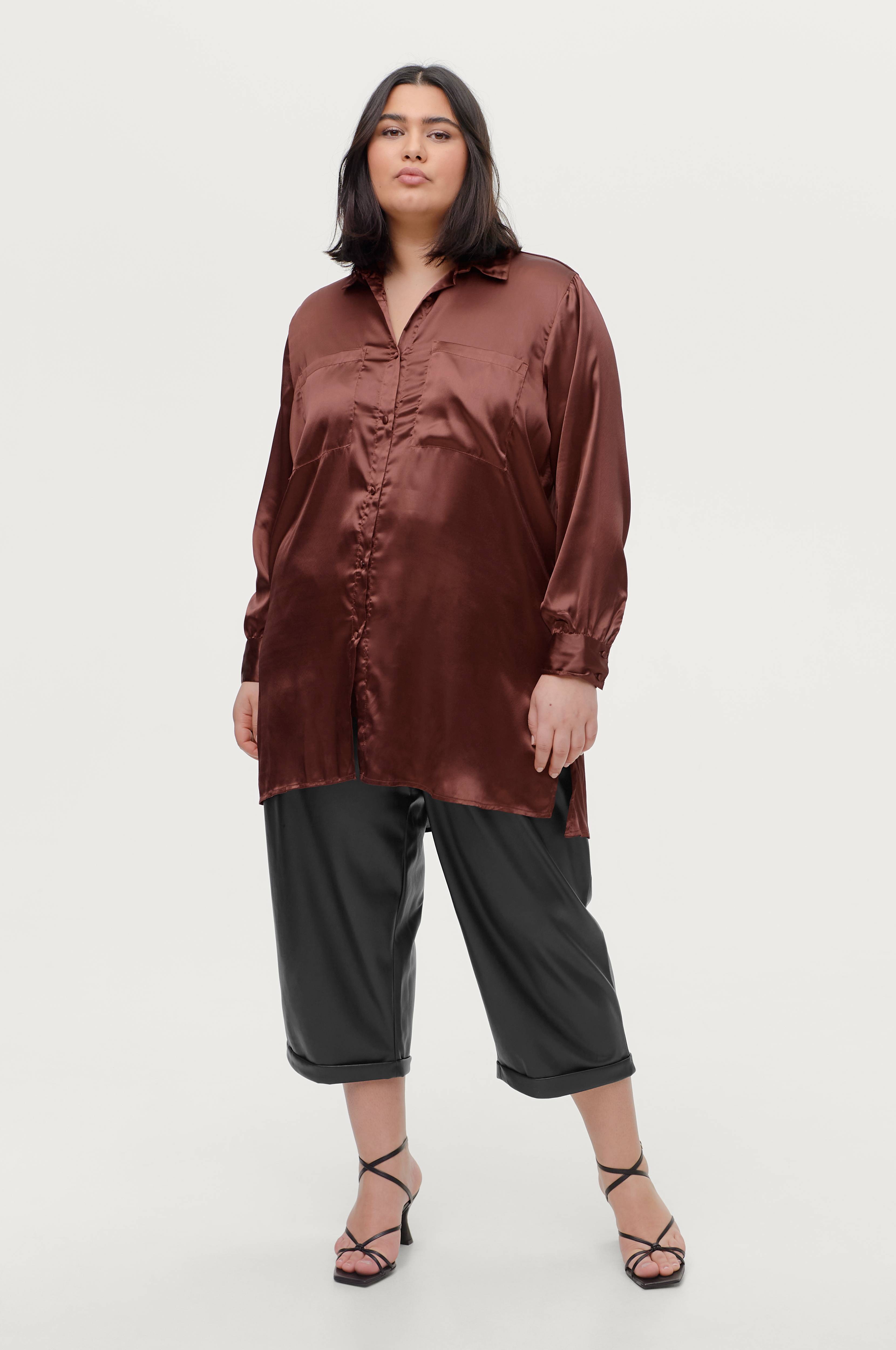 Læglang, vide bukser i imiteret skind med let stretch. Skøn model med elastisk, rynket talje med beklædt knap foran. Snydelommer bagpå og opslag i benkant.