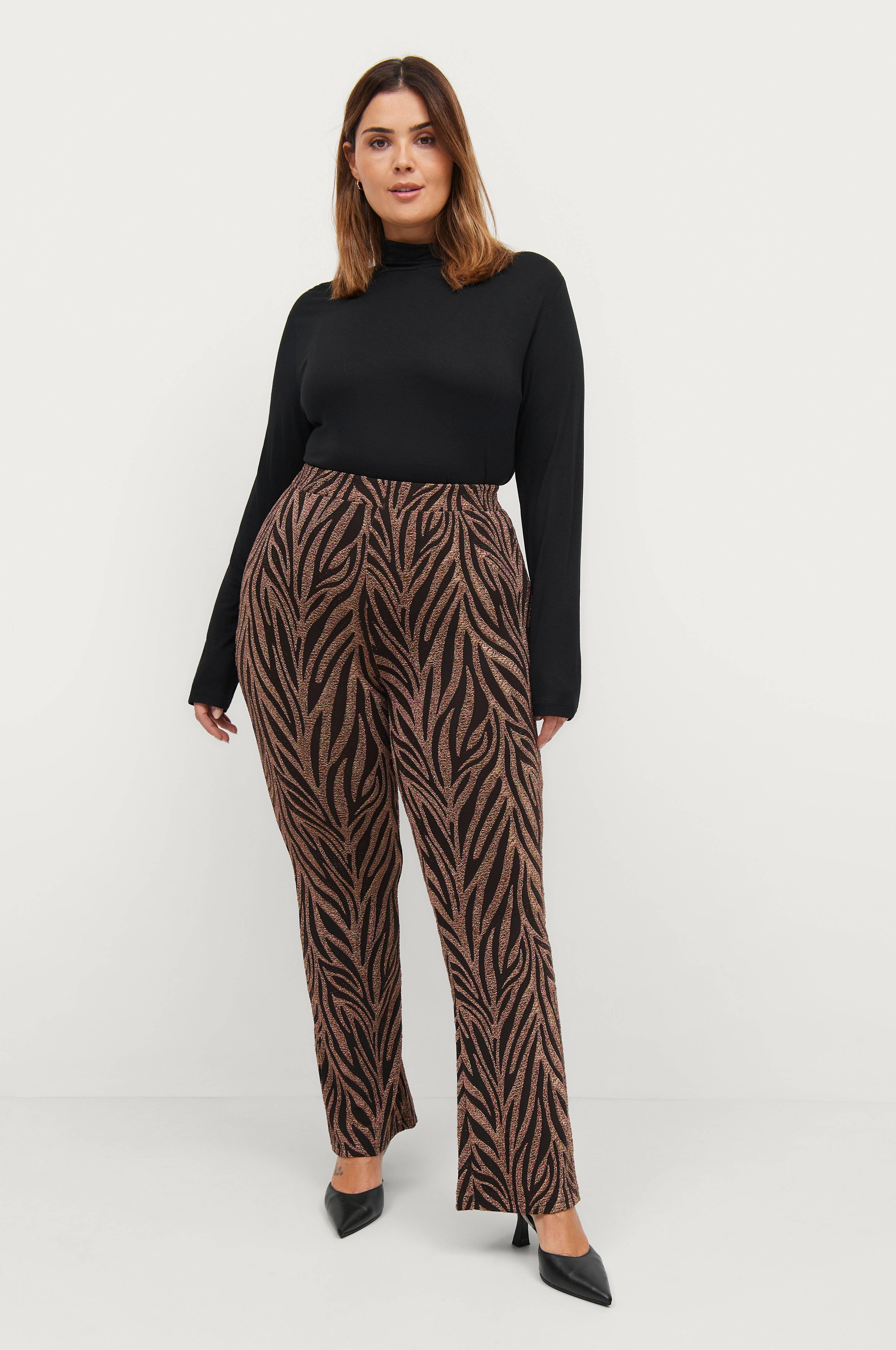 • Bukser i glitrende jersey• Elastisk talje• Noget udsvingende benafslutninger• Store størrelser