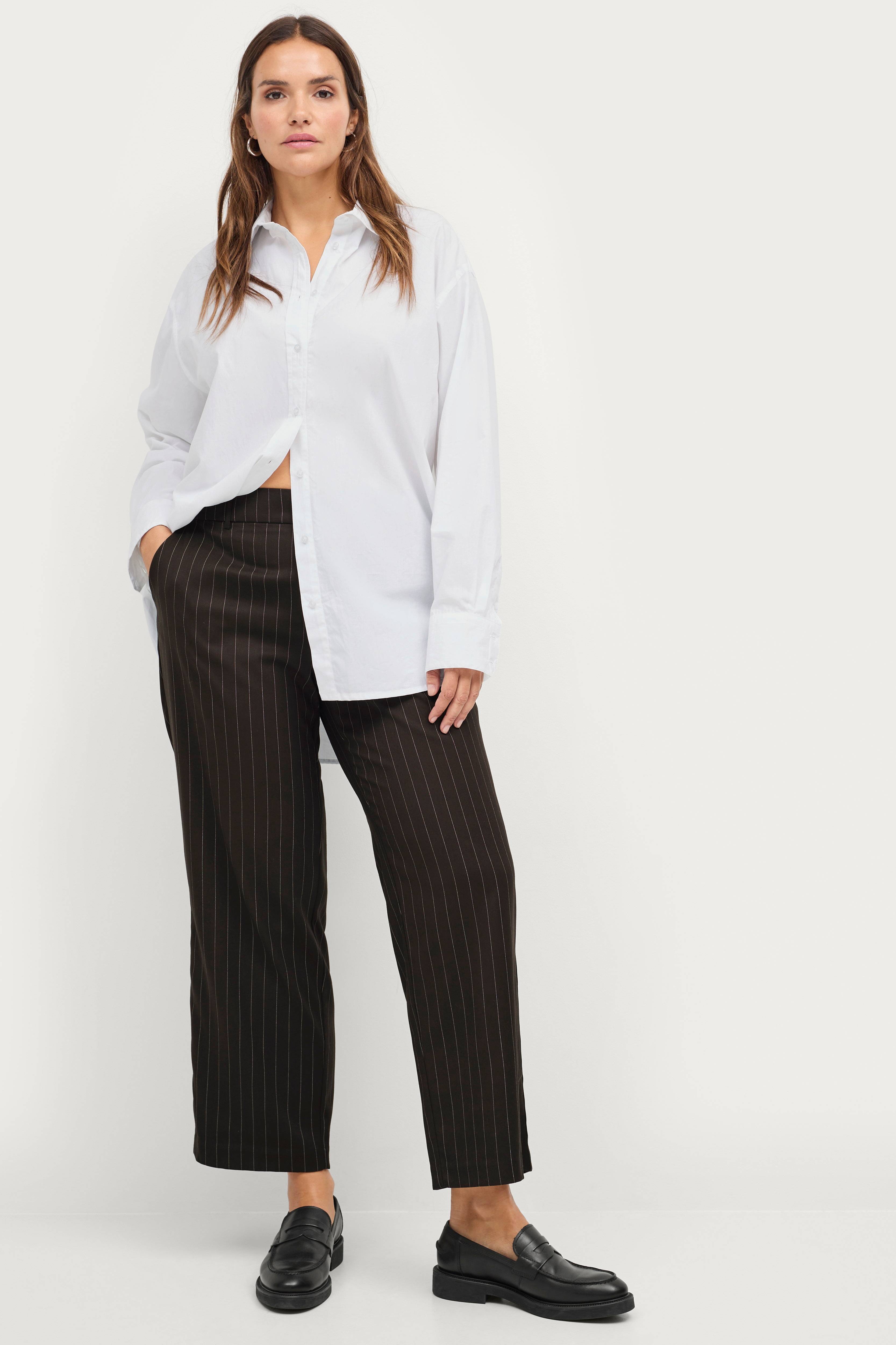 • Store størrelser• Model med brede, lige ben• Taljebånd med stropper og indlagt elastisk bånd bagpå• Skrå lommer foran• Indlagte snydelommer bagpå