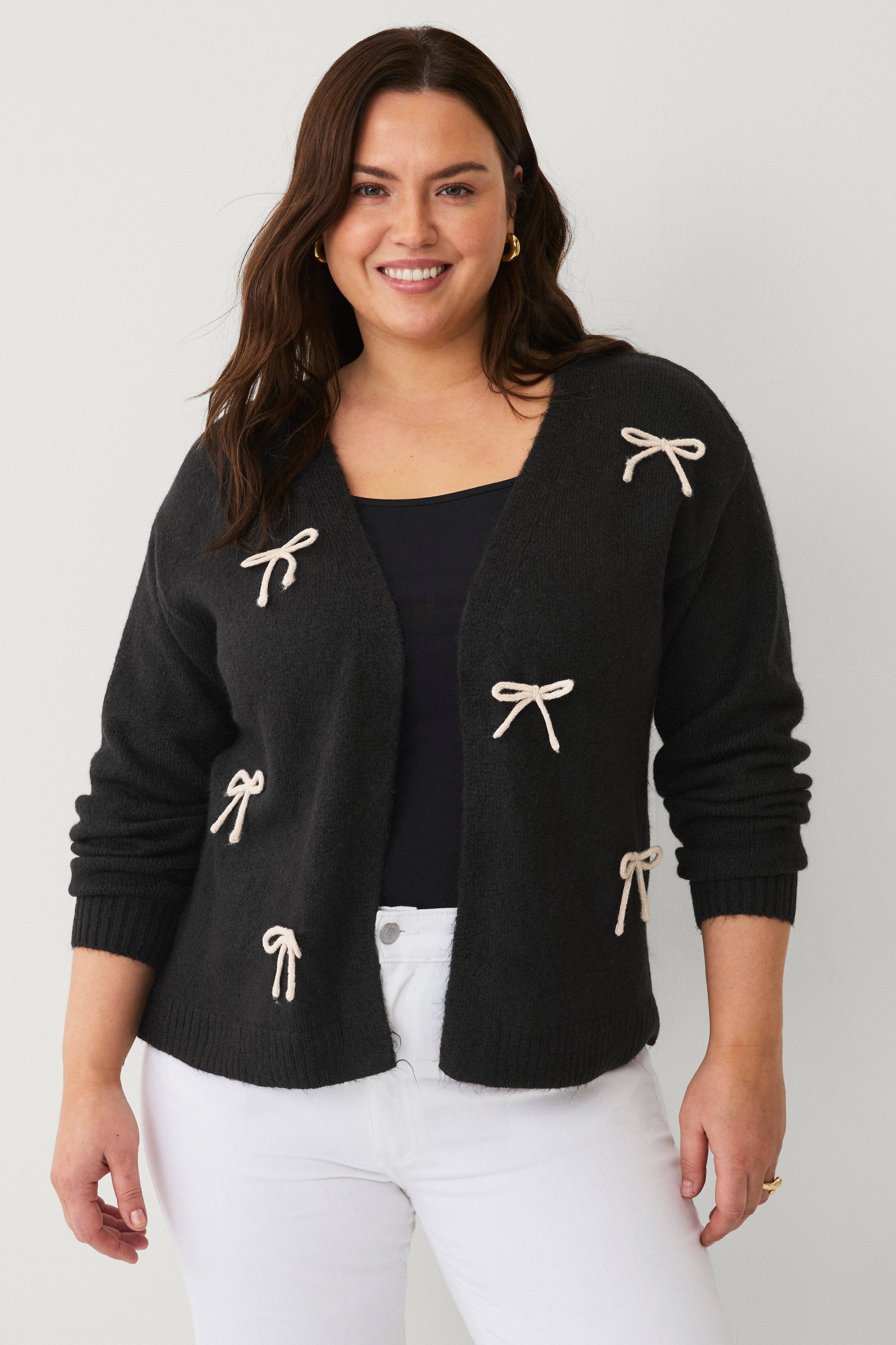 • Kort, strikket cardigan med påsyede bånd• Åben, uden knaplukning model• Løs pasform• Ribstrik ved manchetterne og nederst• Store størrelser