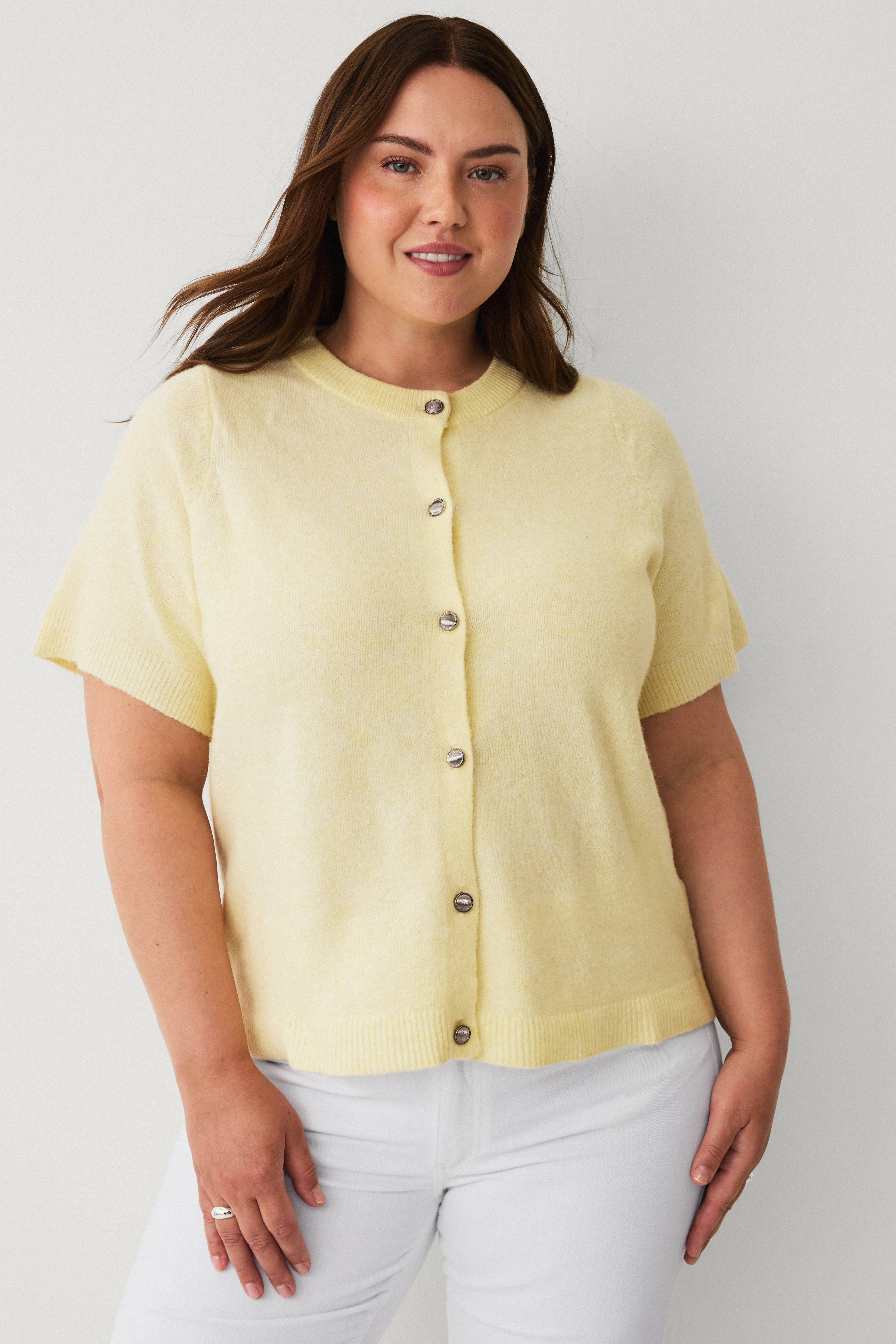 • Fintstrikket cardigan med korte ærmer• Rund, ribbet halsudskæring• Knapper foran• Ribkanter ved ærmeafslutningerne og ved nederste kant• Plusstørrelser