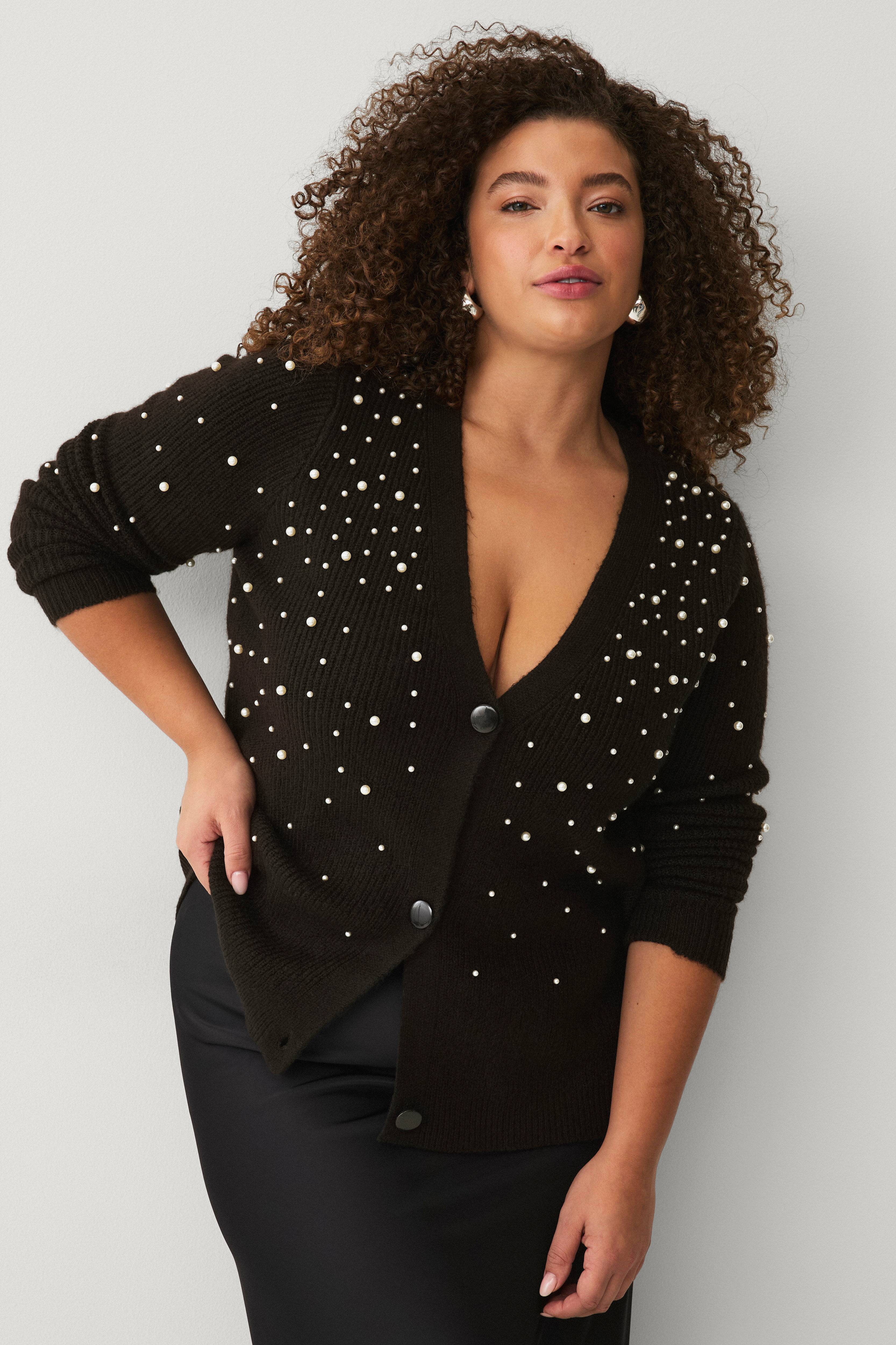 • Store størrelser• Lige model med broderede perler foran og på ærmerne• Dyb v-udskæring• Knapper foran• Langt ærme