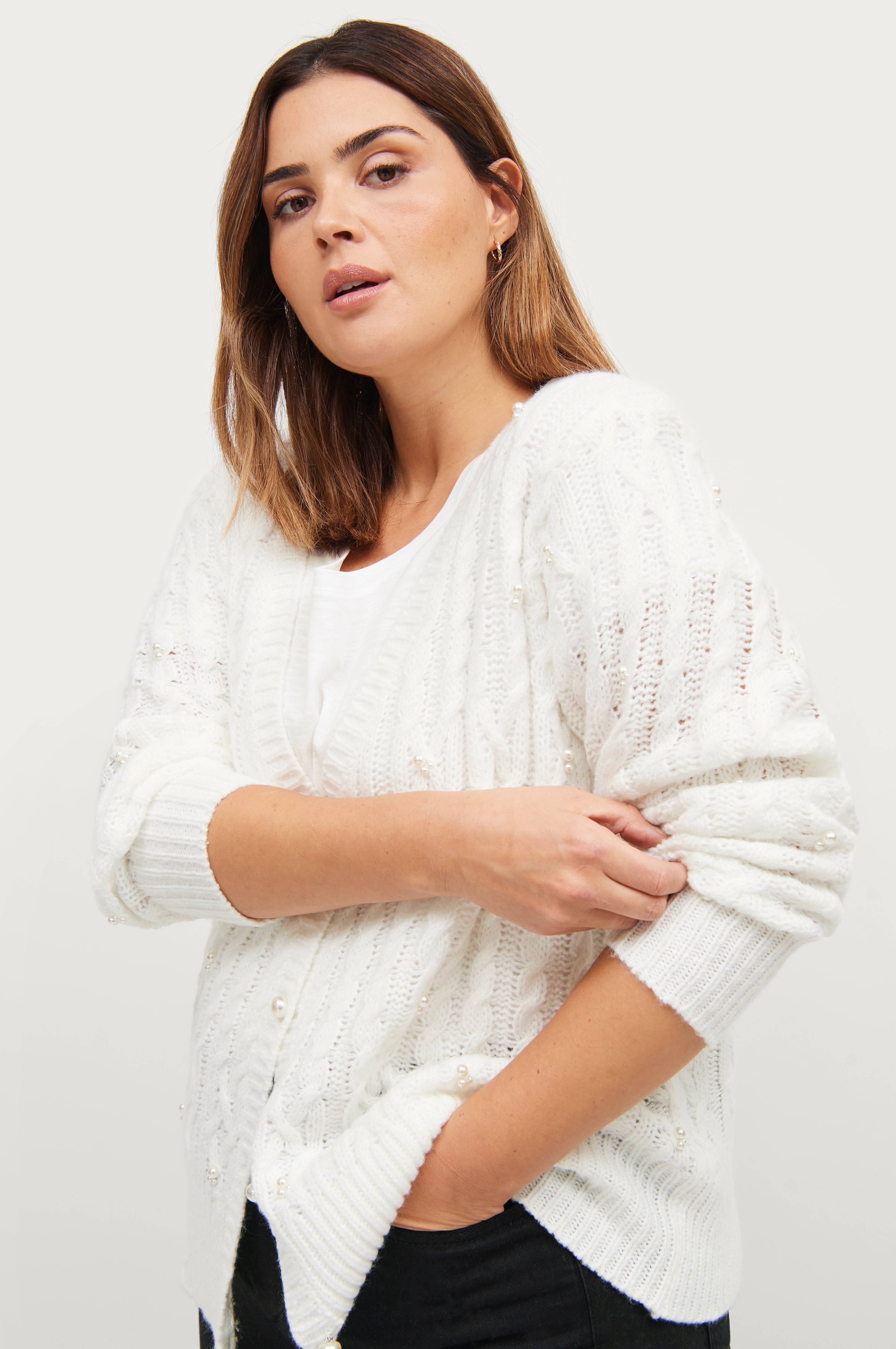 • Kabelstrikket cardigan• Dyb v-udskæring• Dekorative, påsyede perler hele vejen rundt• Perleknaper• Brede ribmanchetter ved manchetterne og nederst• Store størrelser