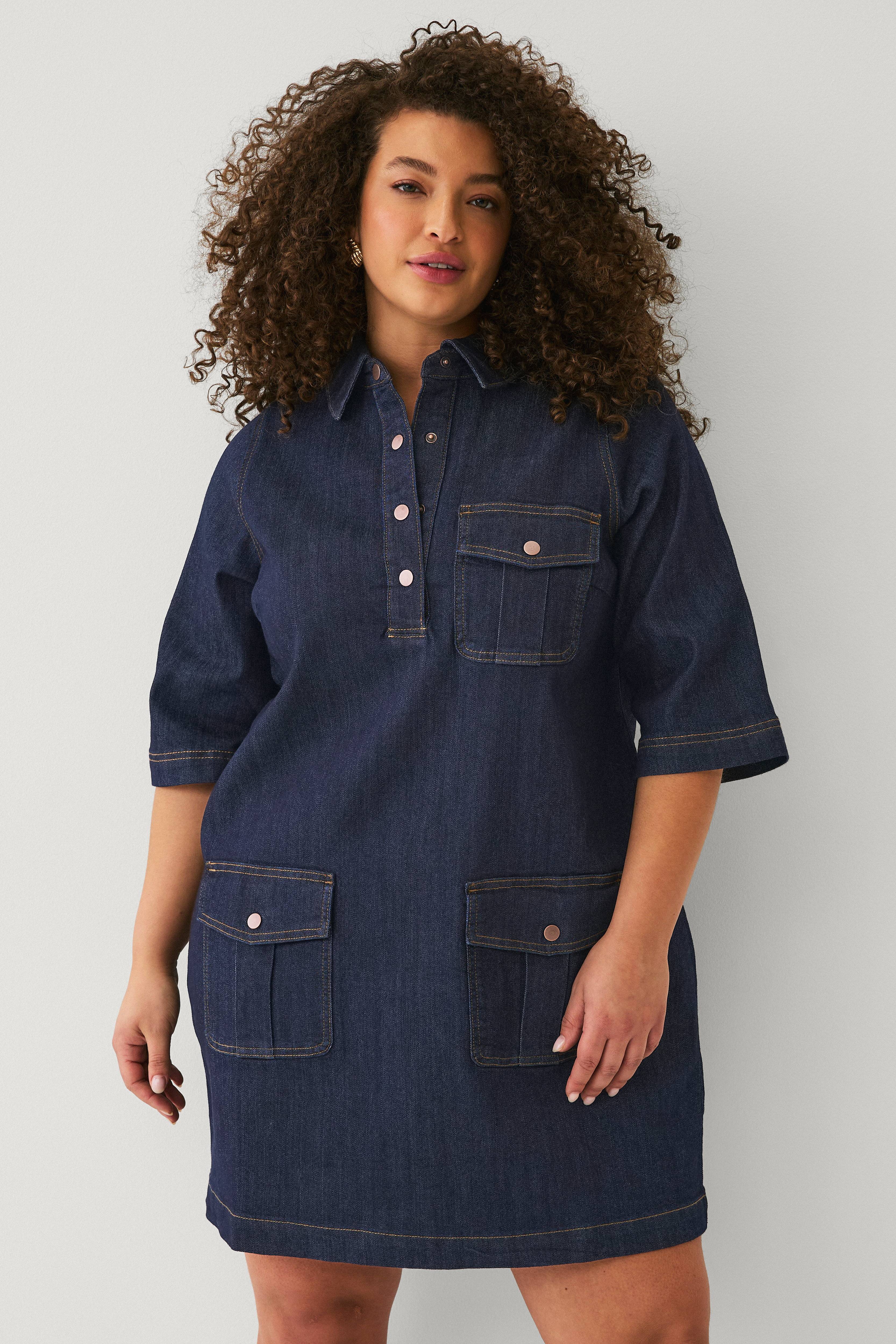 • Kort cowboykjole med krave• Fire trykknapper oppe foran• 3/4 lange ærmer• Tre lommer med knapbare lommelåg• Store størrelser• Længde: 90 cm i størrelse S