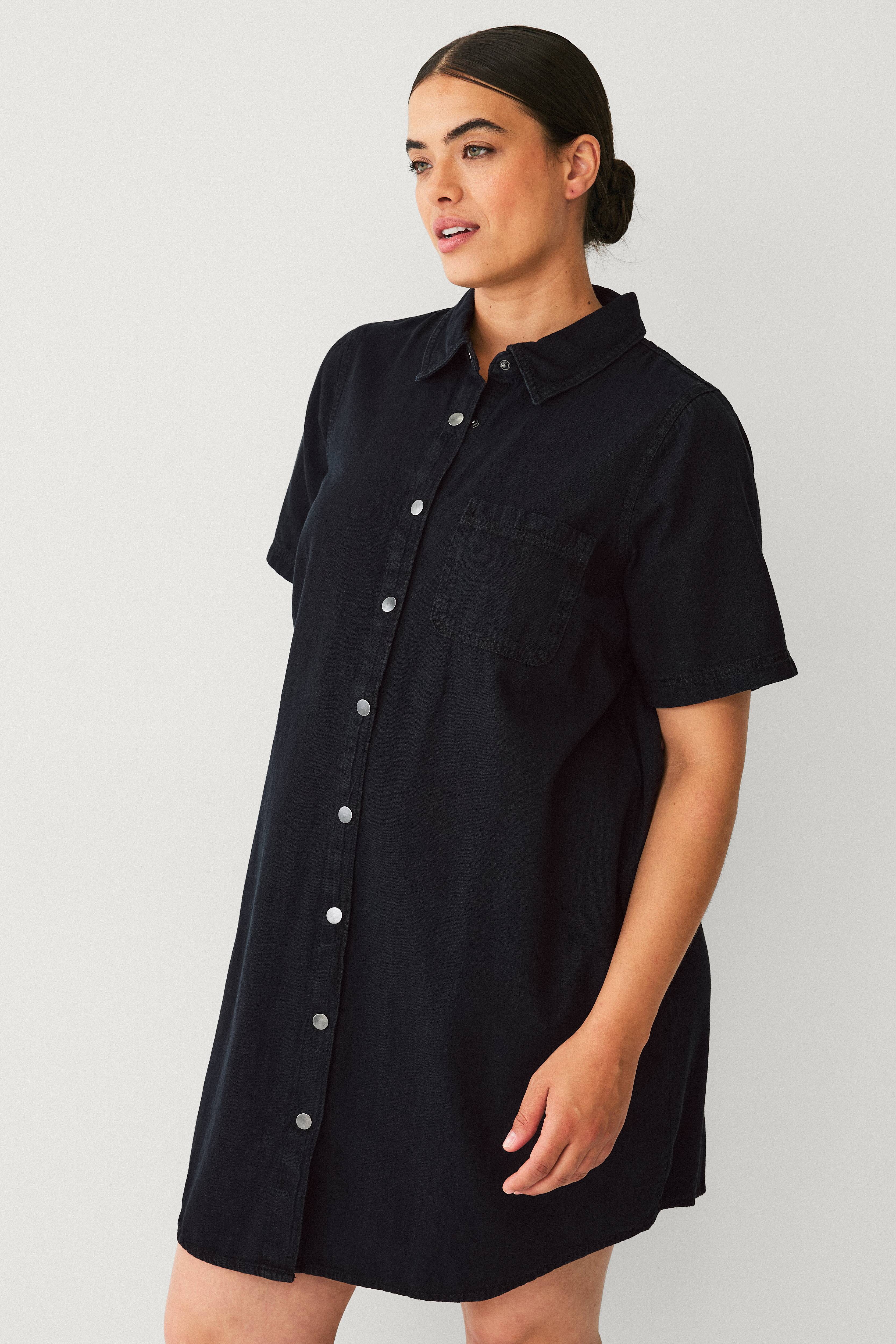 • Kortærmet cowboykjole med skjortemodel• Brystlomme• Trykknapper foran• Afrundet søm• Store størrelser• Længde: 95 cm i størrelse S