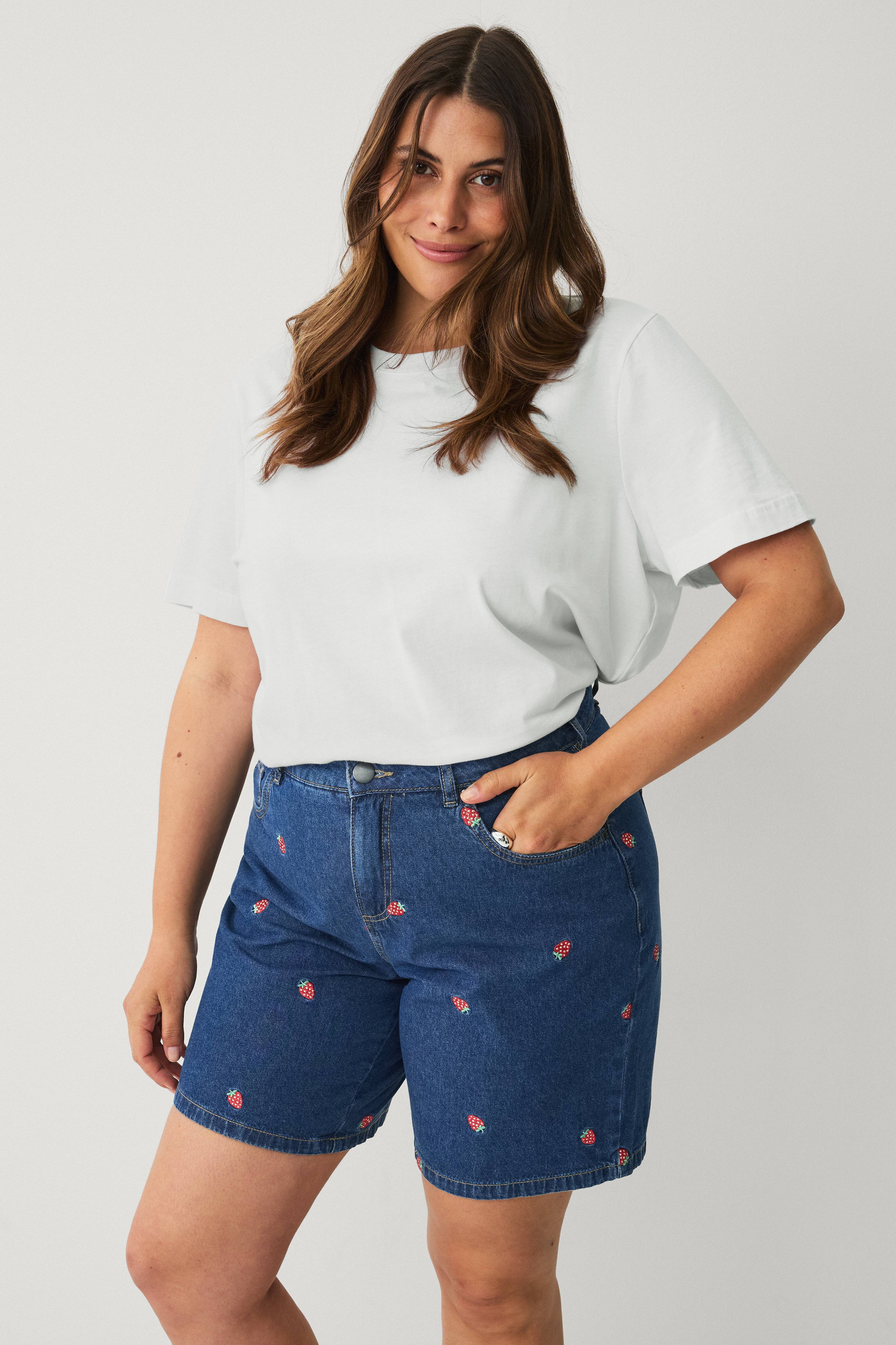 • Denimshorts i bomuld• Høj talje med indvendig elastik• Femlommemodel• Gylp med lynlås med knaplukning• Broderede detaljer overalt• Store størrelser• Indre benlængde: 22 cm i størrelse 42